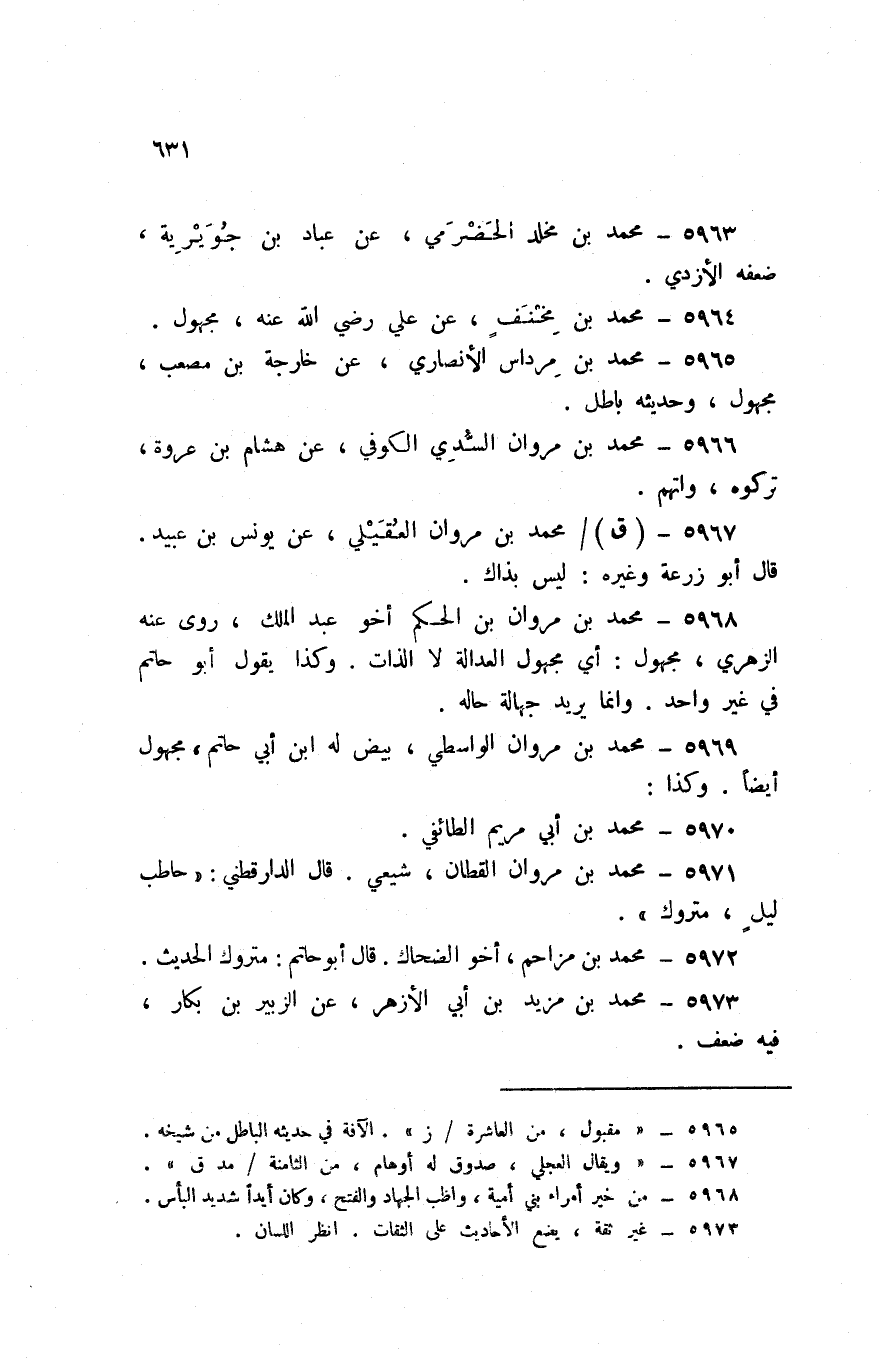 5968 - مُحَمَّد بن مَرْوَان بن الحكم أَخُو عبد الْملك روى عَنهُ الزُّهْرِيّ مَجْهُول أَي مَجْهُول الْعَدَالَة لَا الذَّات وَكَذَا يَقُول أَبُو حَاتِم فِي غير وَاحِد وانما يُرِيد جَهَالَة حَاله