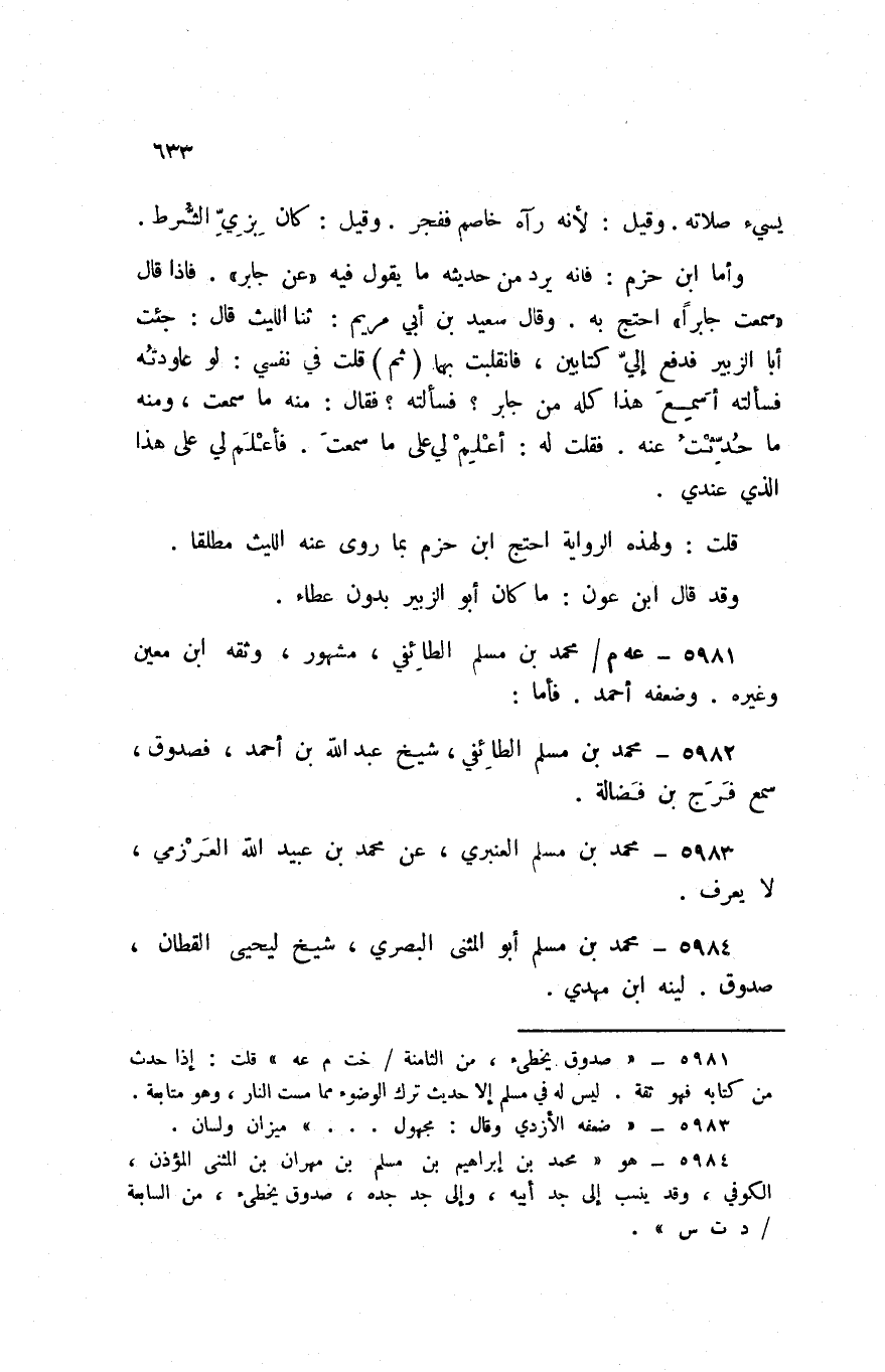 وَأما ابْن حزم فانه يرد من حَدِيثه مَا يَقُول فِيهِ عَن جَابر فاذا قَالَ سَمِعت جَابِرا احْتج بِهِ وَقَالَ سعيد بن أبي مَرْيَم ثَنَا اللَّيْث قَالَ جِئْت أَبَا الزبير فَدفع إِلَيّ كتابين فَانْقَلَبت بهما ثمَّ قلت فِي نَفسِي لَو عاودته فَسَأَلته أسمع هَذَا كُله من جَابر فَسَأَلته فَقَالَ مِنْهُ مَا سَمِعت وَمِنْه مَا حدثت عَنهُ فَقلت لَهُ أعلم لي على مَا سَمِعت فَأعْلم لي على هَذَا الَّذِي عِنْدِي