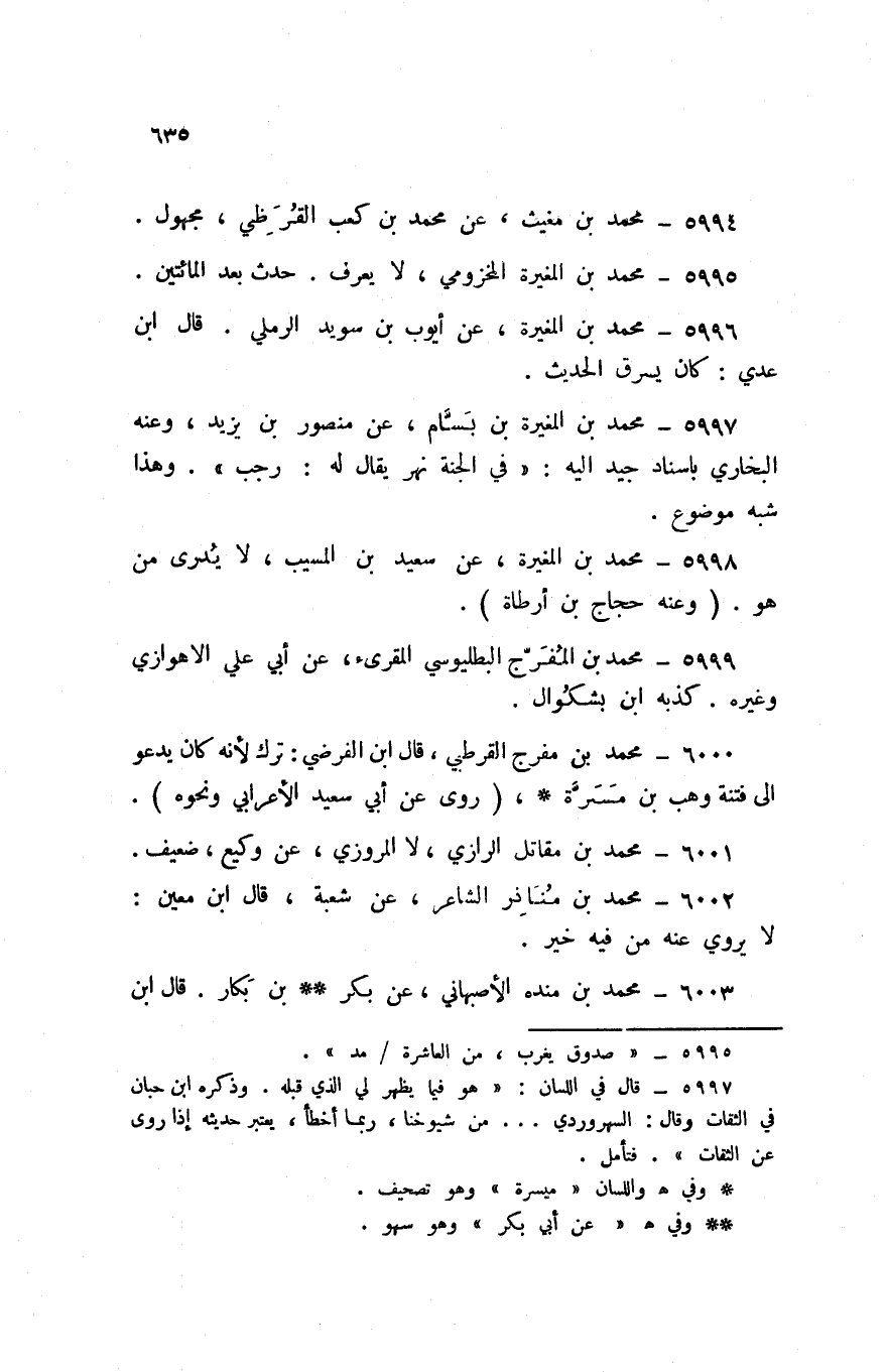 6000 - مُحَمَّد بن مفرج الْقُرْطُبِيّ قَالَ ابْن الفرضي ترك لِأَنَّهُ كَانَ يَدْعُو إِلَى فتْنَة وهب بن مَسَرَّة روى عَن أبي سعيد الْأَعرَابِي وَنَحْوه