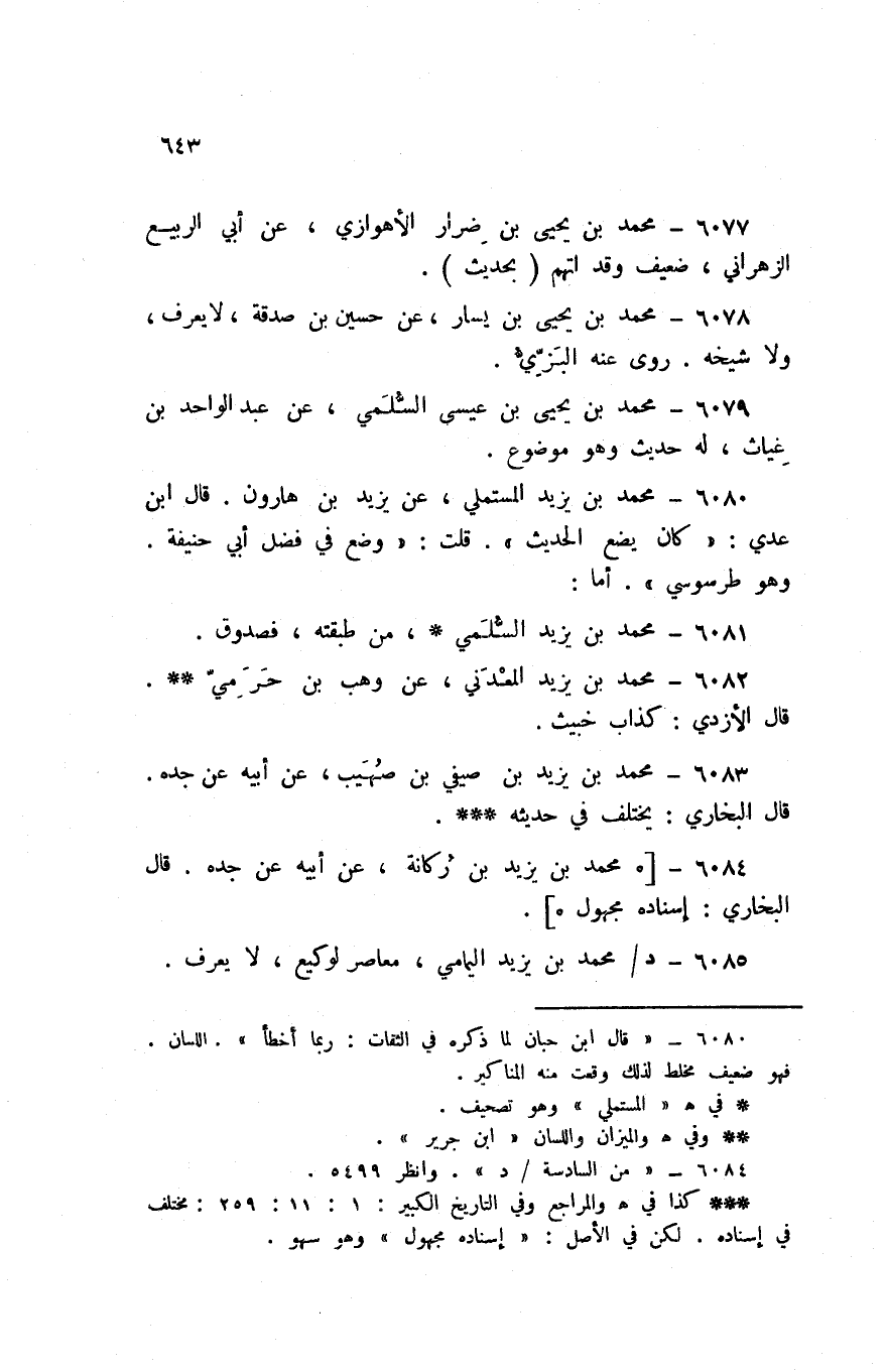6080 - مُحَمَّد بن يزِيد الْمُسْتَمْلِي عَن يزِيد بن هَارُون قَالَ ابْن عدي كَانَ يضع الحَدِيث قلت وضع فِي فضل أبي حنيفَة وَهُوَ طرسوسي أما