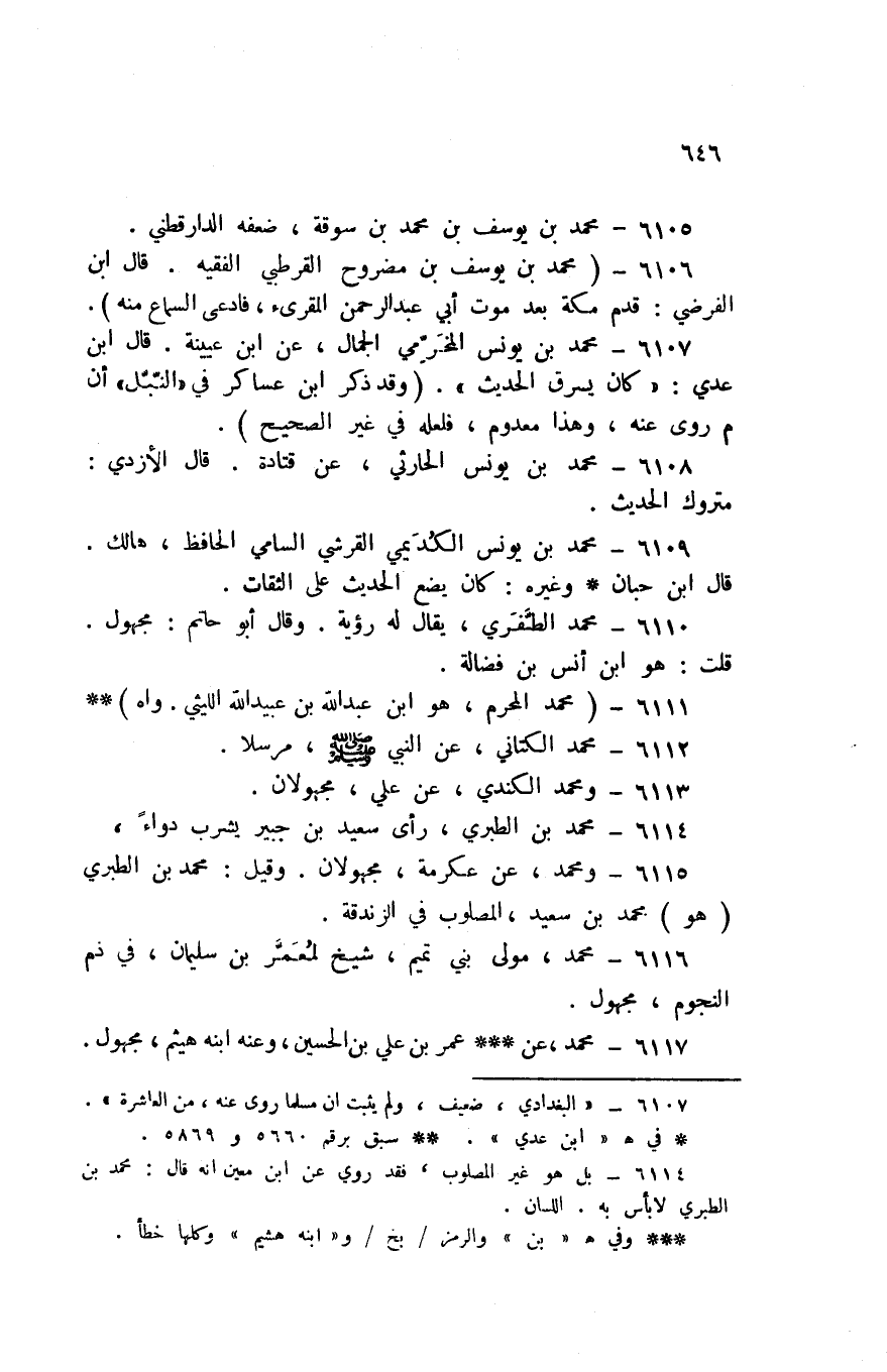 6106 - مُحَمَّد بن يُوسُف بن مضروح الْقُرْطُبِيّ الْفَقِيه قَالَ ابْن الفرضي قدم مَكَّة بعد موت أبي عبد الرَّحْمَن الْمُقْرِئ فَادّعى السماعه مِنْهُ