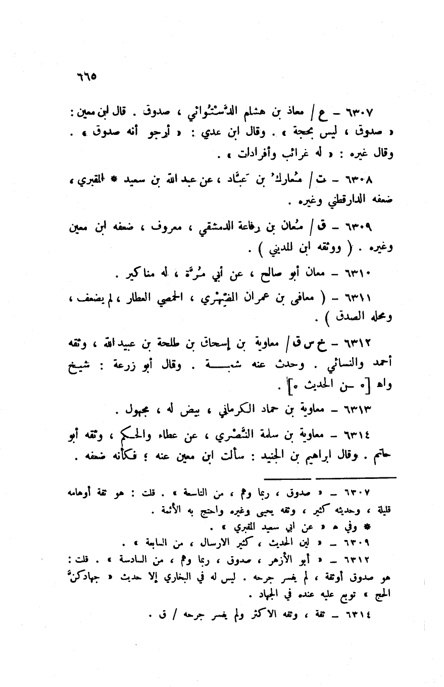 6307 - ع / معَاذ بن هِشَام الدستوَائي صَدُوق قَالَ ابْن معِين صَدُوق لَيْسَ بِحجَّة وَقَالَ ابْن عدي ارجو أَنه صَدُوق وَقَالَ غَيره لَهُ غرائب وأفرادات