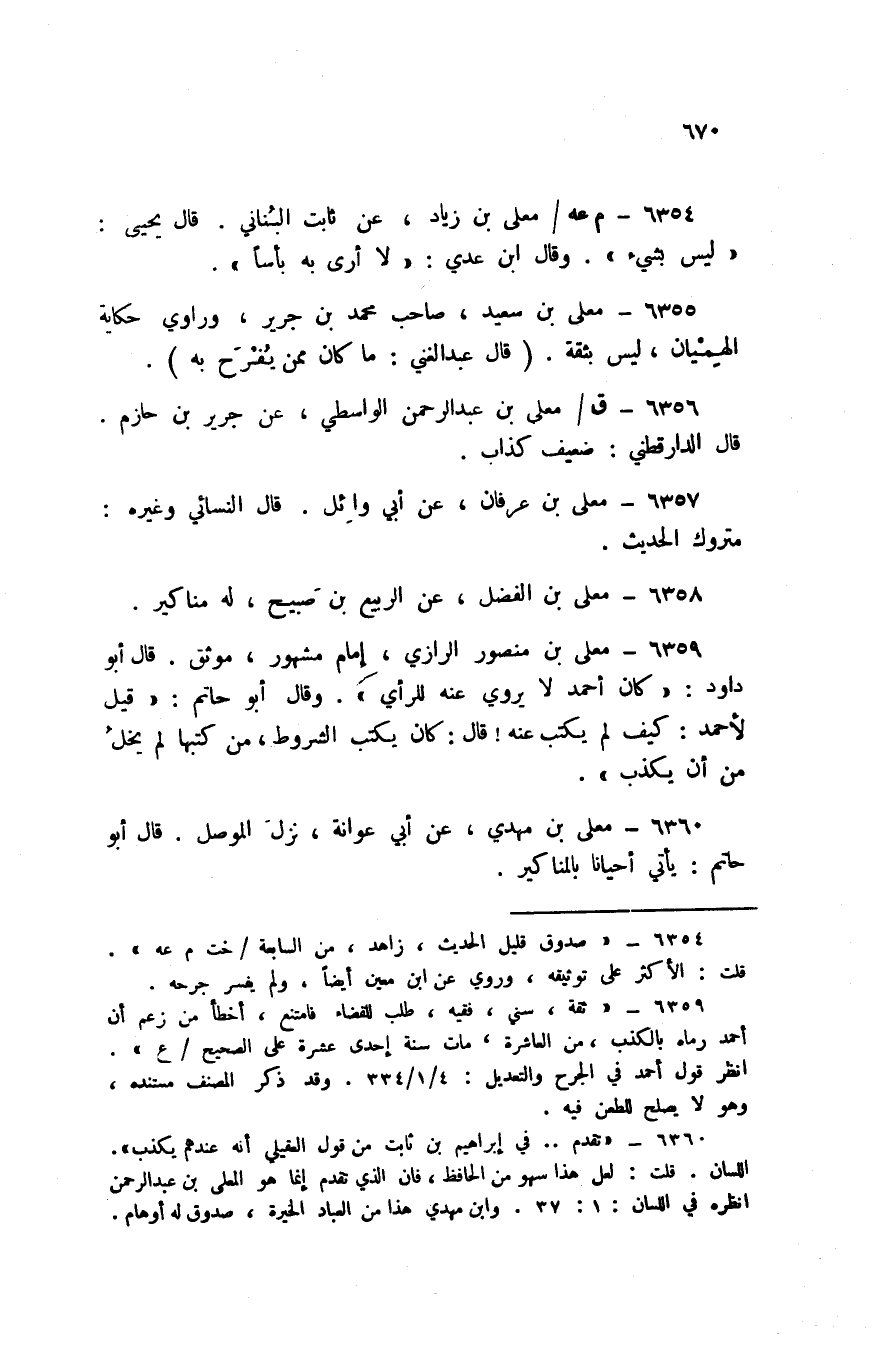 6359 - مُعلى بن مَنْصُور الرَّازِيّ إِمَام مَشْهُور موثق قَالَ أَبُو دَاوُد كَانَ أَحْمد لَا يروي عَنهُ للرأي وَقَالَ أَبُو حَاتِم قيل لِأَحْمَد كَيفَ لم يكْتب عَنهُ قَالَ كَانَ يكْتب الشُّرُوط من كتبهَا لم يخل من أَن يكذب