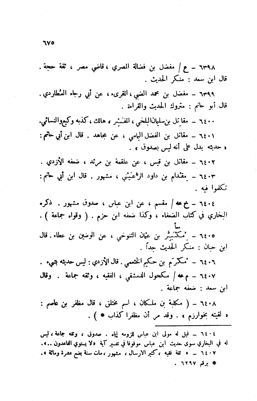 6399 - مفضل بن مُحَمَّد الضَّبِّيّ الْمُقْرِئ عَن ابي رَجَاء العطاردي قَالَ ابو حَاتِم مَتْرُوك الحَدِيث وَالْقِرَاءَة