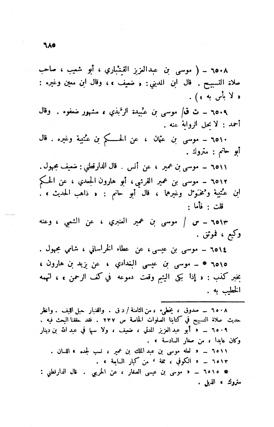 6508 - مُوسَى بن عبد الْعَزِيز القنباري أَبُو شُعَيْب صَاحب صَلَاة التَّسْبِيح قَالَ ابْن الْمَدِينِيّ ضَعِيف وَقَالَ ابْن معِين وَغَيره لَا بَأْس بِهِ