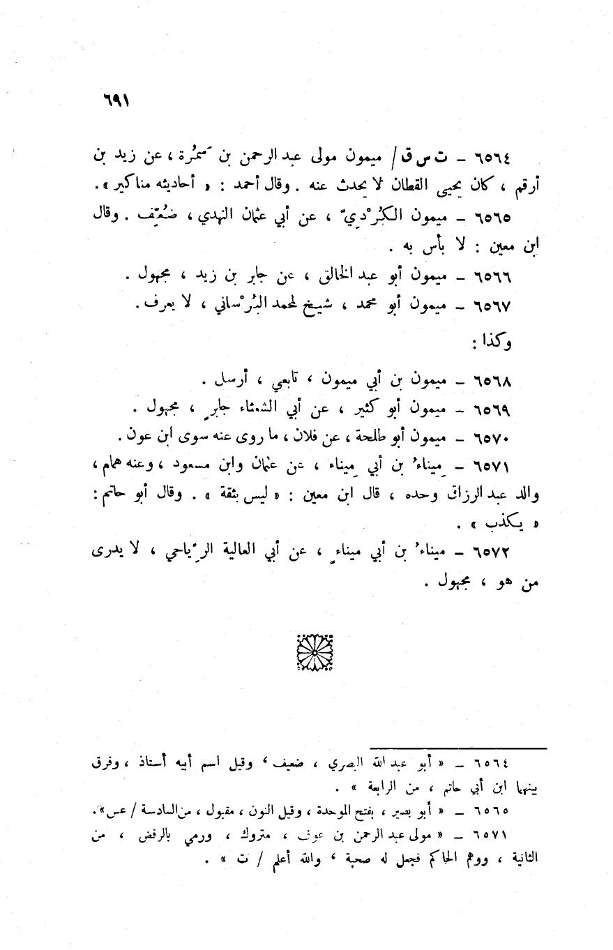 6564 - ت س ق / مَيْمُون مولى عبد الرَّحْمَن بن سَمُرَة عَن زيد بن أَرقم كَانَ يحيى الْقطَّان لَا يحدث عَنهُ وَقَالَ أَحْمد أَحَادِيثه مَنَاكِير