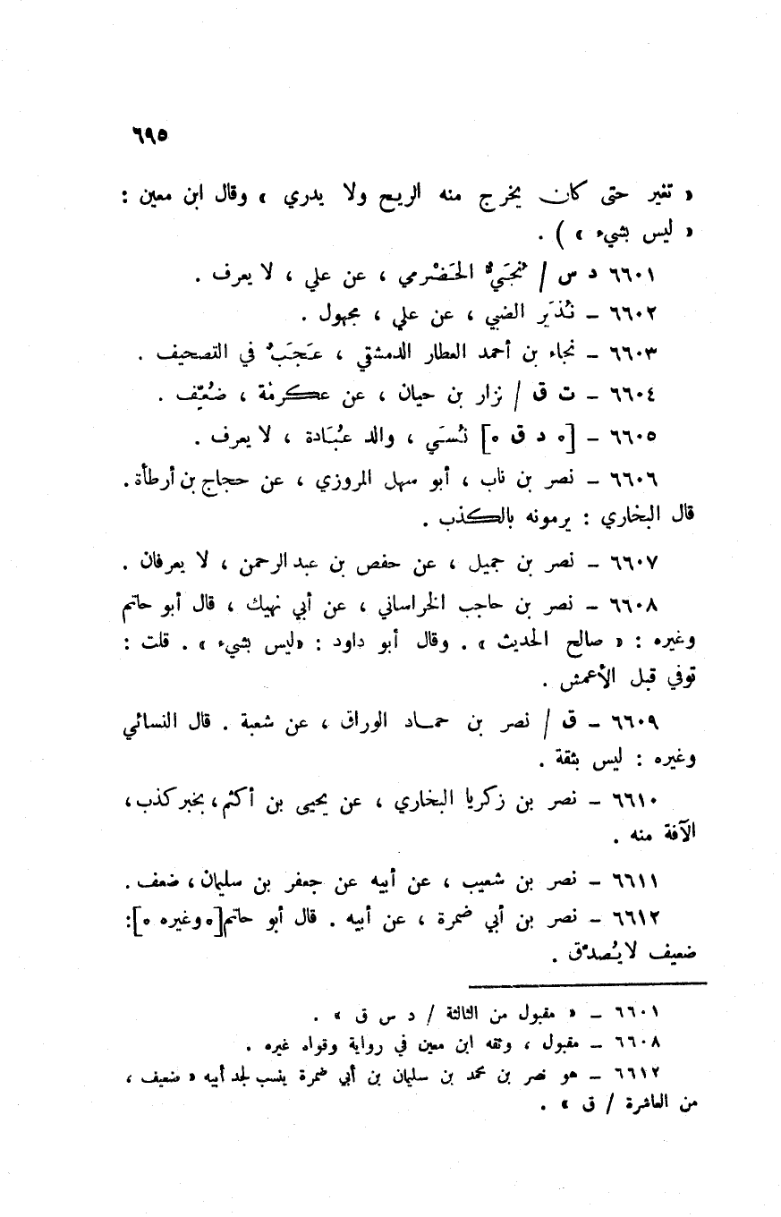 6612 - نصر بن ابي ضَمرَة عَن أَبِيه قَالَ أَبُو حَاتِم وَغَيره ضَعِيف لَا يصدق
