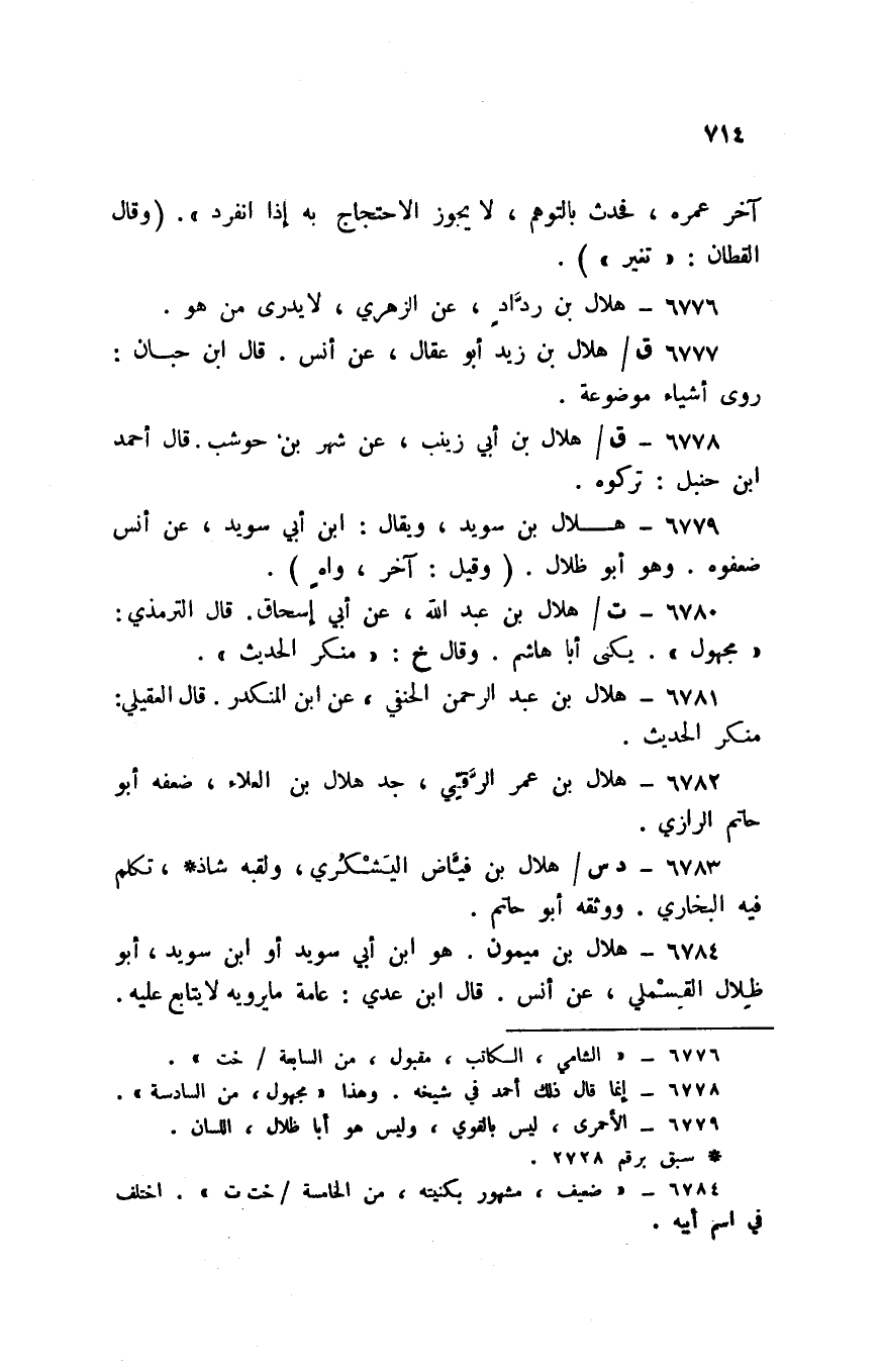 6780 - ت / هِلَال بن عبد الله عَن أبي اسحاق قَالَ التِّرْمِذِيّ مَجْهُول يكنى أَبَا هَاشم وَقَالَ خَ مُنكر الحَدِيث