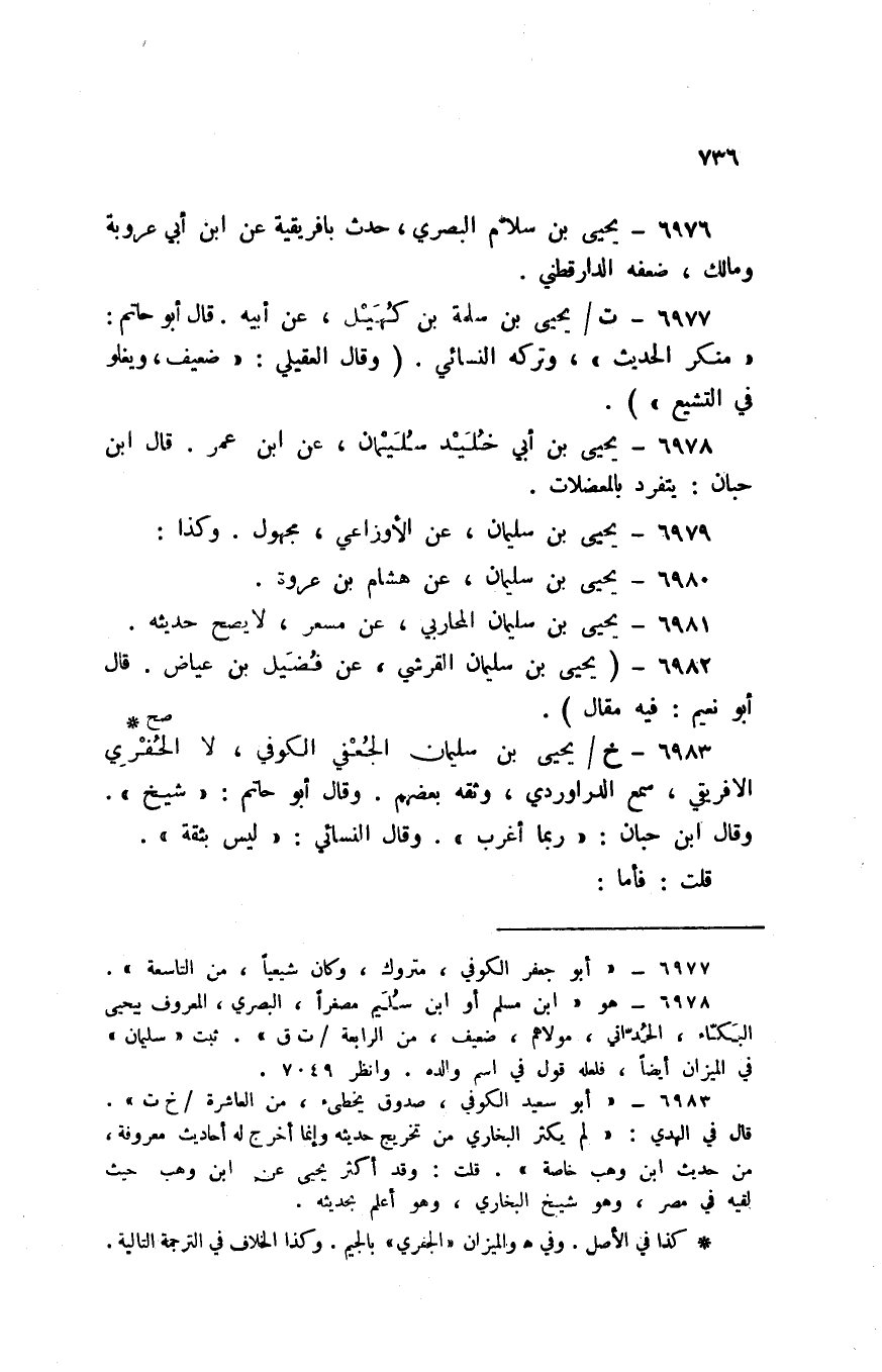 6983 - خَ / يحيى بن سُلَيْمَان الْجعْفِيّ الْكُوفِي لَا الْحَفرِي الافريقي سمع الدَّرَاورْدِي وَثَّقَهُ بَعضهم وَقَالَ أَبُو حَاتِم شيخ وَقَالَ ابْن حبَان رُبمَا أغرب وَقَالَ النَّسَائِيّ لَيْسَ بِثِقَة قلت فَأَما