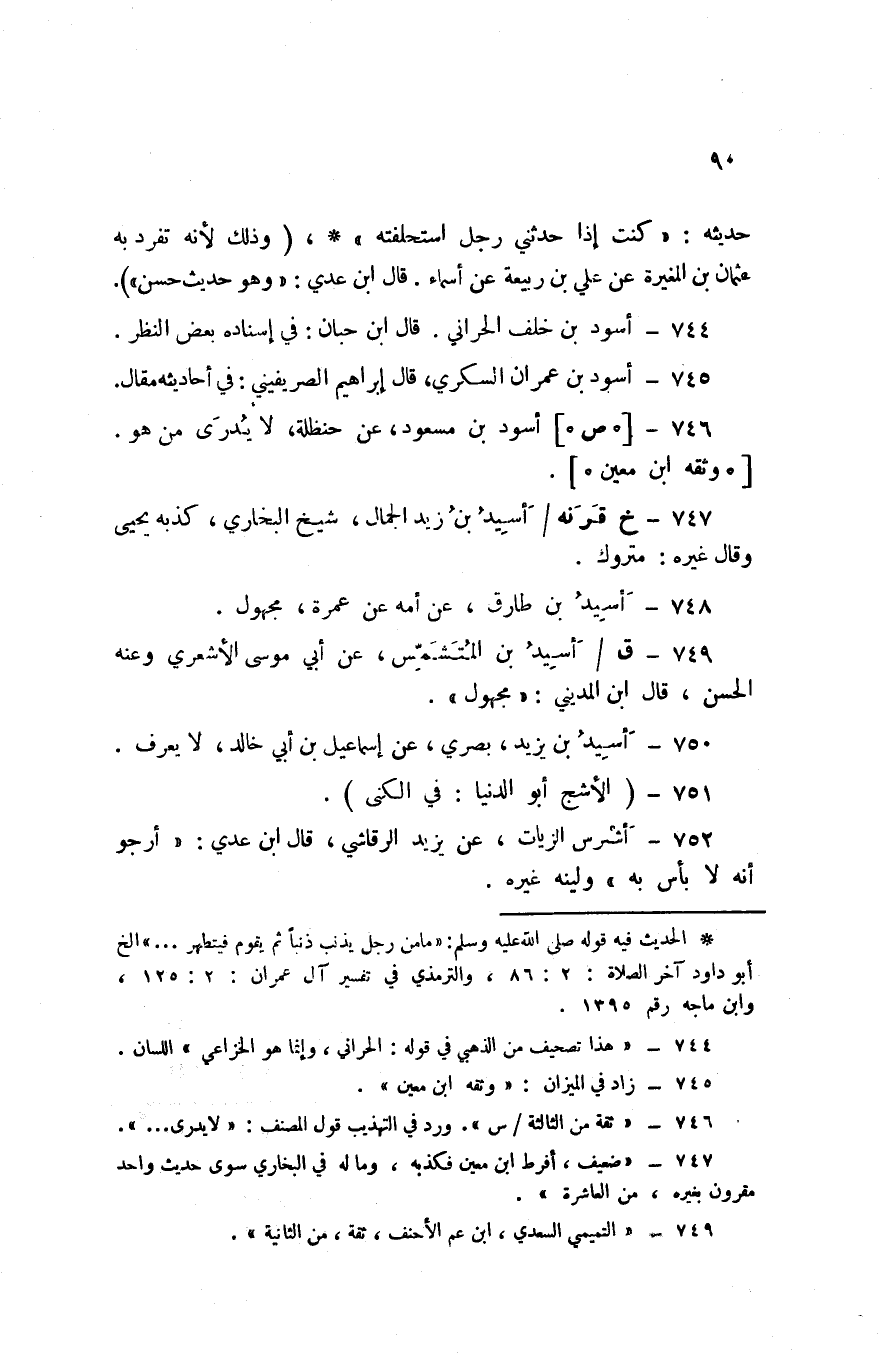 حَدِيثه كنت اذا حَدثنِي رجل اسْتَحْلَفته وَذَلِكَ لانه تفرد بِهِ عُثْمَان بن الْمُغيرَة عَن عَليّ بن ربيعَة عَن اسماء قَالَ ابْن عدي وَهُوَ حَدِيث حسن
