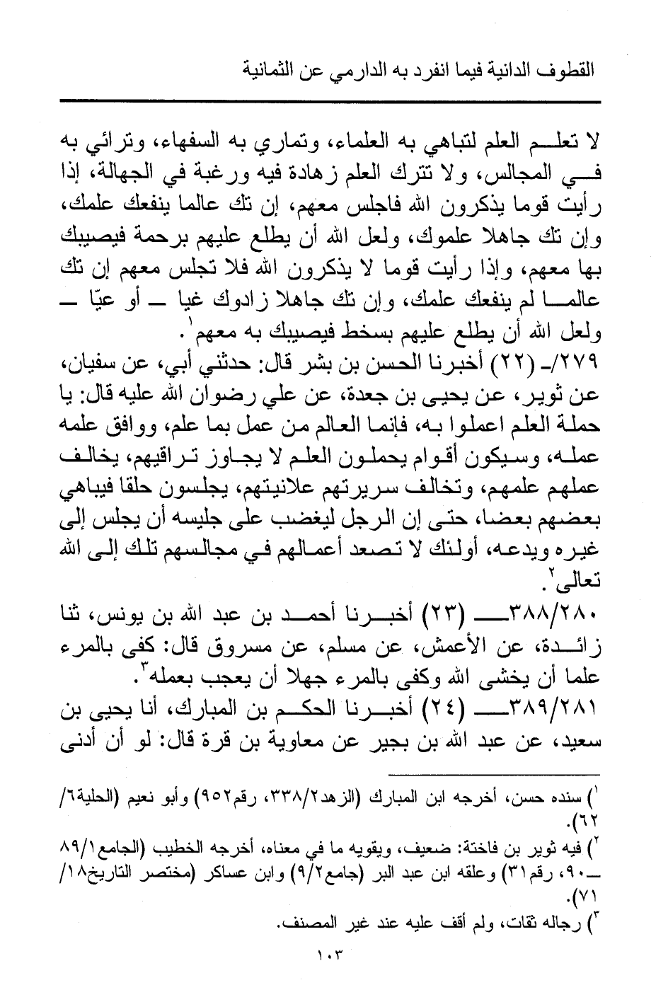280/ 388 - (23) أخبرنا أحمد بن عبد الله بن يونس، ثنا زائدة، عن الأعمش، عن مسلم، عن مسروق قال: كفى بالمرء علما أن يخشى الله وكفى بالمرء جهلا أن يعجب بعمله (¬3).