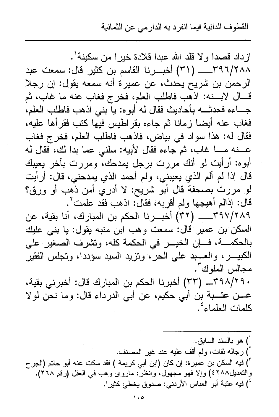 290/ 398 - (33) أخبرنا الحكم بن المبارك قال: أخبرني بقية، عن عتبة بن أبي حكيم، عن أبي الدرداء قال: وما نحن لولا كلمات العلماء (¬4).