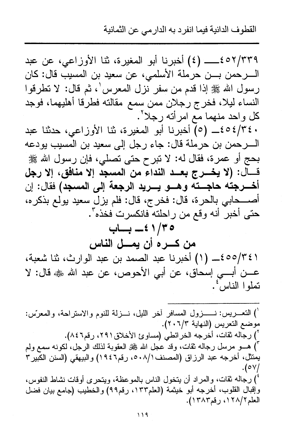 341/ 455 - (1) أخبرنا عبد الصمد بن عبد الوارث، ثنا شعبة، عن أبي إسحاق، عن أبي الأحوص، عن عبد الله - رضي الله عنه - قال: لا تملوا الناس (¬4).