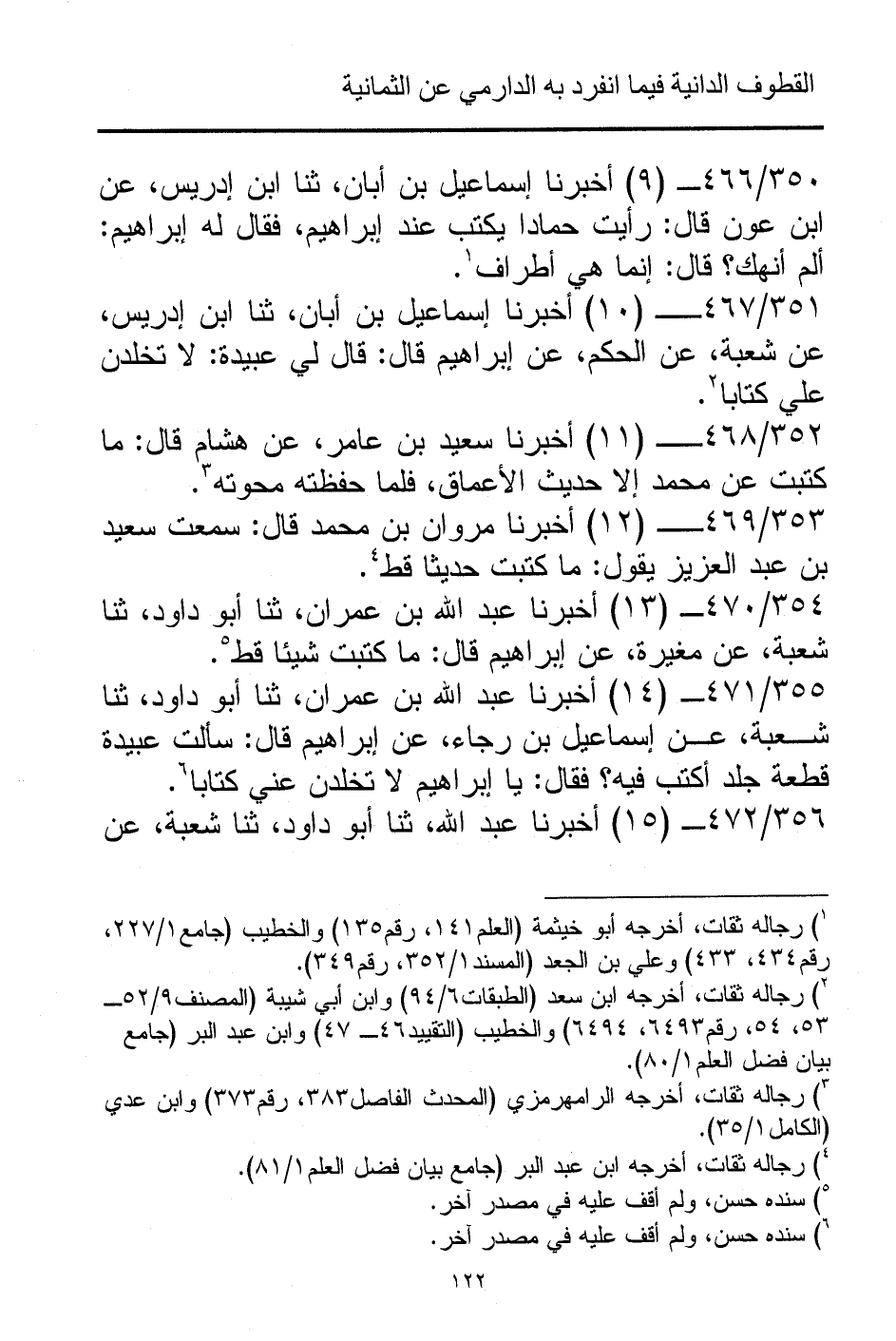 354/ 470 - (13) أخبرنا عبد الله بن عمران، ثنا أبو داود، ثنا شعبة، عن مغيرة، عن إبراهيم قال: ما كتبت شيئا قط (¬5).
