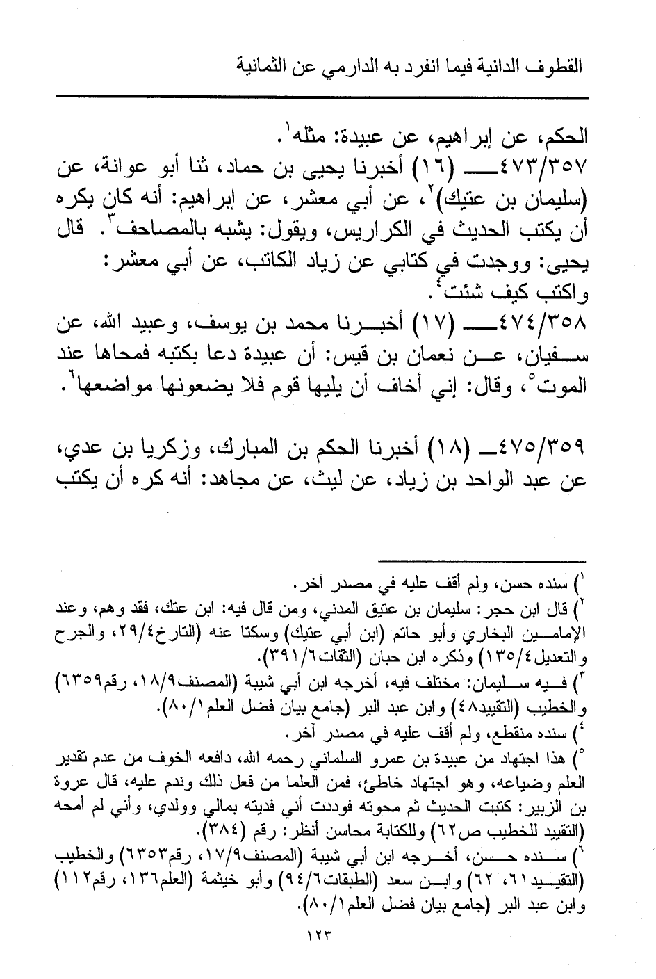 357/ 473 - (16) أخبرنا يحيى بن حماد، ثنا أبو عوانة، عن (سليمان بن عتيك) (¬2)، عن أبي معشر، عن إبراهيم: أنه كان يكره أن يكتب الحديث في الكراريس، ويقول: يشبه بالمصاحف (¬3). قال يحيى: ووجدت في كتابي عن زياد الكاتب، عن أبي معشر: واكتب كيف شئت (¬4).