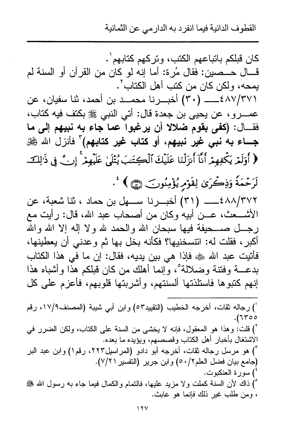 371/ 487 - (30) أخبرنا محمد بن أحمد، ثنا سفيان، عن عمرو، عن يحيى بن جعدة قال: أتي النبي - صلى الله عليه وسلم - بكتف فيه كتاب، فقال: (كفى بقوم ضلالا أن يرغبوا عما جاء به نبيهم إلى ما جاء به نبي غير نبيهم، أو كتاب غير كتابهم) (¬3) فأنزل الله - عز وجل - {أَوَلَمْ يَكْفِهِمْ أَنَّا أَنْزَلْنَا عَلَيْكَ الْكِتَابَ يُتْلَى عَلَيْهِمْ إِنَّ فِي ذَلِكَ لَرَحْمَةً وَذِكْرَى لِقَوْمٍ يُؤْمِنُونَ} (¬4).