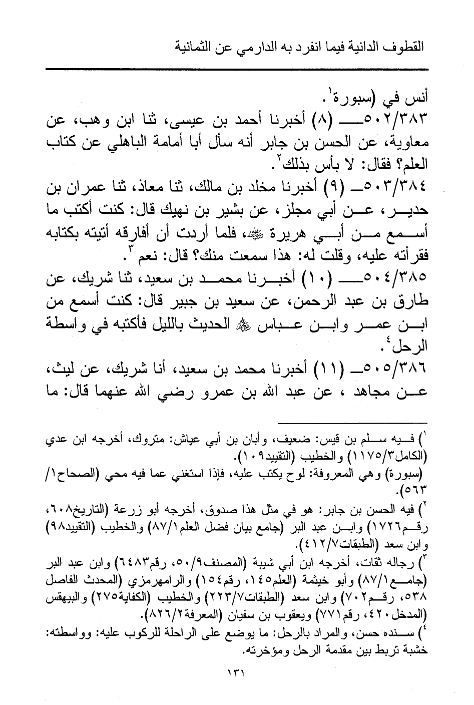 385/ 504 - (10) أخبرنا محمد بن سعيد، ثنا شريك، عن طارق بن عبد الرحمن، عن سعيد بن جبير قال: كنت أسمع من ابن عمر وابن عباس - رضي الله عنهم - الحديث بالليل فأكتبه في واسطة الرحل (¬4).