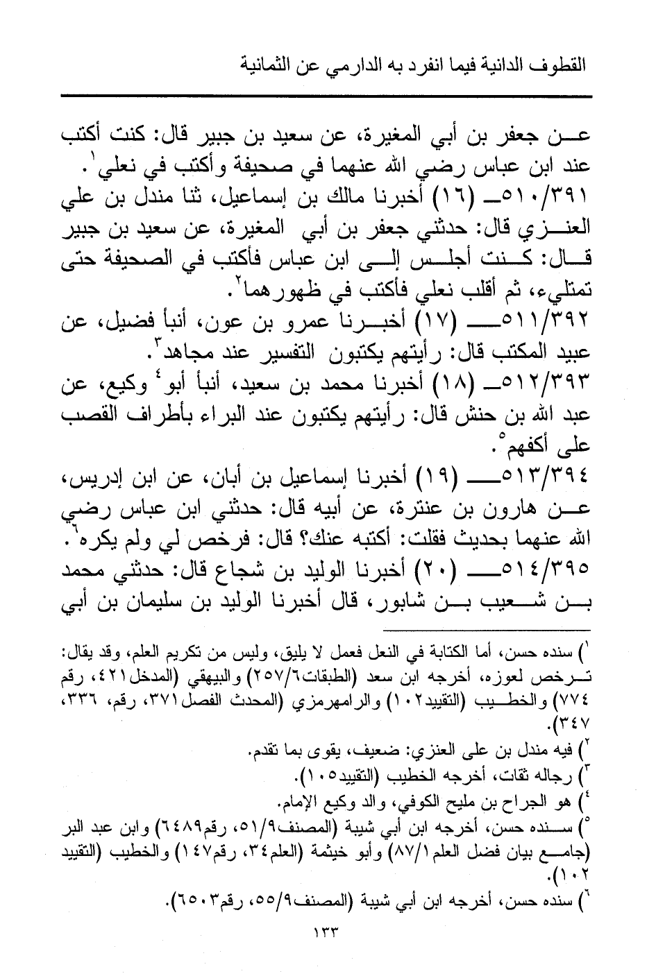 391/ 510 - (16) أخبرنا مالك بن إسماعيل، ثنا مندل بن علي العنزي قال: حدثني جعفر بن أبي المغيرة، عن سعيد بن جبير قال: كنت أجلس إلى ابن عباس فأكتب في الصحيفة حتى تمتليء، ثم أقلب نعلي فأكتب في ظهورهما (¬2).