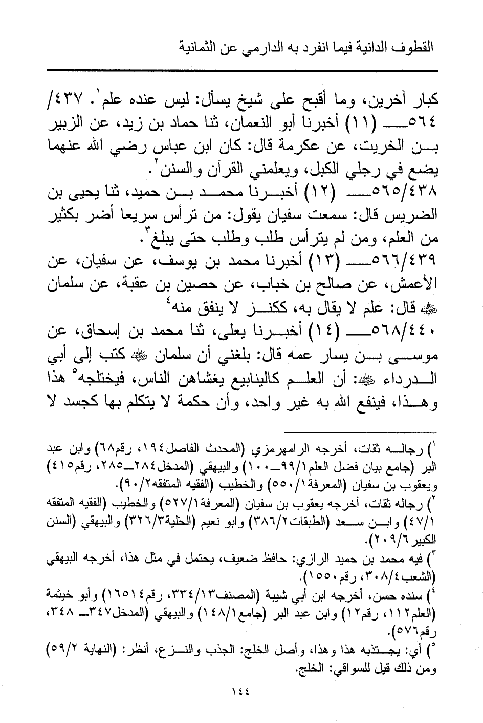 (¬4) سنده حسن، أخرجه ابن أبي شيبة (المصنف 13/ 334، رقم 16514) وأبو خيثمة (العلم 112، رقم 12) وابن عبد البر (جامع 1/ 148) والبيهقي (المدخل 347 - 348، رقم 576).