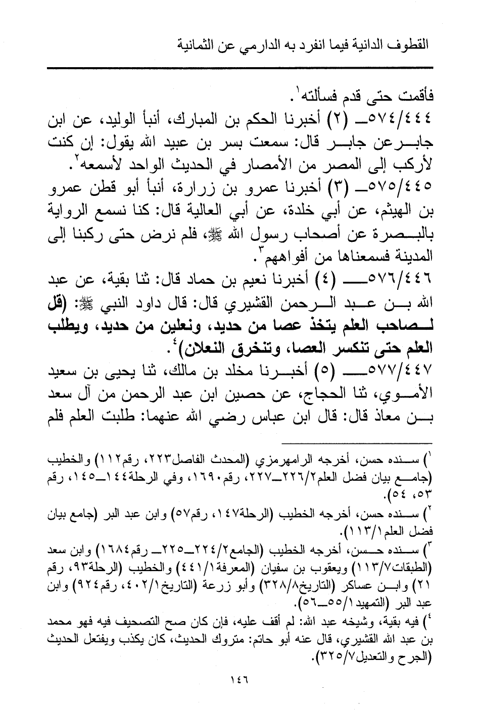 446/ 576 - (4) أخبرنا نعيم بن حماد قال: ثنا بقية، عن عبد الله بن عبد الرحمن القشيري قال: قال داود النبي - صلى الله عليه وسلم -: (قل لصاحب العلم يتخذ عصا من حديد، ونعلين من حديد، ويطلب العلم حتى تنكسر العصا، وتنخرق النعلان) (¬4).
