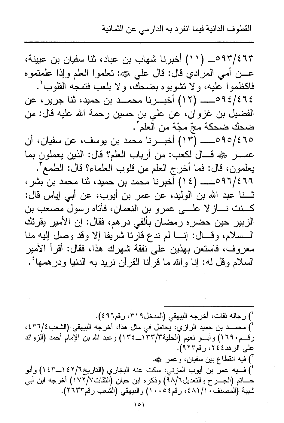 465/ 595 - (13) أخبرنا محمد بن يوسف، عن سفيان، أن عمر - رضي الله عنه - قال لكعب: من أرباب العلم؟ قال: الذين يعملون بما يعلمون، قال: فما أخرج العلم من قلوب العلماء؟ قال: الطمع (¬3).