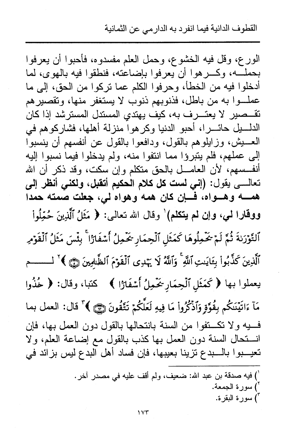 الورع، وقل فيه الخشوع، وحمل العلم مفسدوه، فأحبوا أن يعرفوا بحمله، وكرهوا أن يعرفوا بإضاعته، فنطقوا فيه بالهوى، لما أدخلوا فيه من الخطأ، وحرفوا الكلم عما تركوا من الحق، إلى ما عملوا به من باطل، فذنوبهم ذنوب لا يستغفر منها، وتقصيرهم تقصير لا يعترف به، كيف يهتدي المستدل المسترشد إذا كان الدليل حائرا، أحبو الدنيا وكرهوا منزلة أهلها، فشاركوهم في العيش، وزايلوهم بالقول، ودافعوا بالقول عن أنفسهم أن ينسبوا إلى عملهم، فلم يتبرؤا مما انتفوا منه، ولم يدخلوا فيما نسبوا إليه أنفسهم، لأن العامل بالحق متكلم وإن سكت، وقد ذكر أن الله تعالى يقول: (إني لست كل كلام الحكيم أتقبل، ولكني أنظر إلى همه وهواه، فإن كان همه وهواه لي، جعلت صمته حمدا ووقارا لي، وإن لم يتكلم) (¬1) وقال الله تعالى: {مَثَلُ الَّذِينَ حُمِّلُوا التَّوْرَاةَ ثُمَّ لَمْ يَحْمِلُوهَا كَمَثَلِ الْحِمَارِ يَحْمِلُ أَسْفَارًا بِئْسَ مَثَلُ الْقَوْمِ الَّذِينَ كَذَّبُوا بِآيَاتِ اللَّهِ وَاللَّهُ لَا يَهْدِي الْقَوْمَ الظَّالِمِينَ} (¬2) لم يعملوا بها { ... كَمَثَلِ الْحِمَارِ يَحْمِلُ أَسْفَارًا} كتبا، وقال: {خُذُوا مَا آتَيْنَاكُمْ بِقُوَّةٍ وَاذْكُرُوا مَا فِيهِ لَعَلَّكُمْ تَتَّقُونَ} (¬3) قال: العمل بما فيه ولا تكتفوا من السنة بانتحالها بالقول دون العمل بها، فإن انتحال السنة دون العمل بها كذب بالقول مع إضاعة العلم، ولا تعيبوا بالبدع تزينا بعيبها، فإن فساد أهل البدع ليس بزائد في