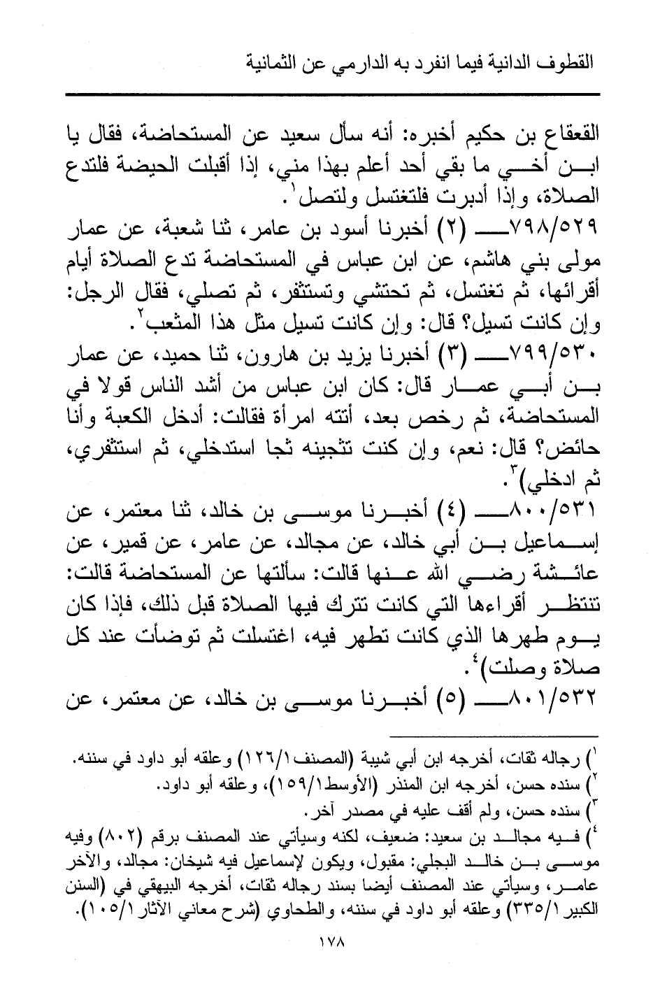 529/ 798 - (2) أخبرنا أسود بن عامر، ثنا شعبة، عن عمار مولى بني هاشم، عن ابن عباس في المستحاضة تدع الصلاة أيام أقرائها، ثم تغتسل، ثم تحتشي وتستثفر، ثم تصلي، فقال الرجل: وإن كانت تسيل؟ قال: وإن كانت تسيل مثل هذا المثعب (¬2).