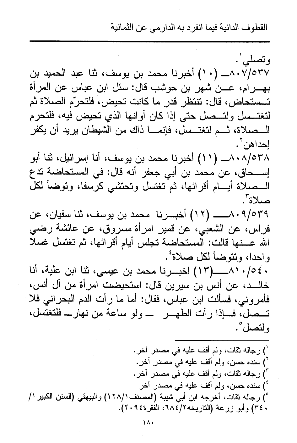 540/ 810 - (13) اخبرنا محمد بن عيسى، ثنا ابن علية، أنا خالد، عن أنس بن سيرين قال: استحيضت امرأة من آل أنس، فأمروني، فسألت ابن عباس، فقال: أما ما رأت الدم البحراني فلا تصل، فإذا رأت الطهر - ولو ساعة من نهار - فلتغتسل، ولتصل (¬5).