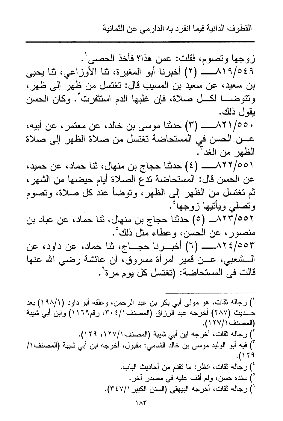 549/ 819 - (2) أخبرنا أبو المغيرة، ثنا الأوزاعي، ثنا يحيى بن سعيد، عن سعيد بن المسيب قال: تغتسل من ظهر إلى ظهر، وتتوضأ لكل صلاة، فإن غلبها الدم استثفرت (¬2). وكان الحسن يقول ذلك.