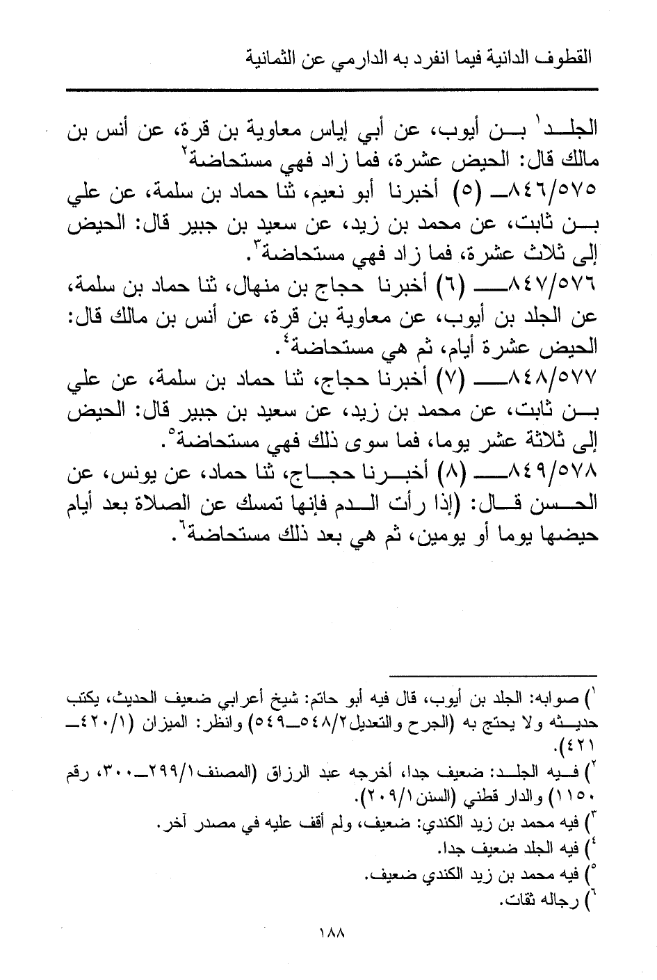 576/ 847 - (6) أخبرنا حجاج بن منهال، ثنا حماد بن سلمة، عن الجلد بن أيوب، عن معاوية بن قرة، عن أنس بن مالك قال: الحيض عشرة أيام، ثم هي مستحاضة (¬4).