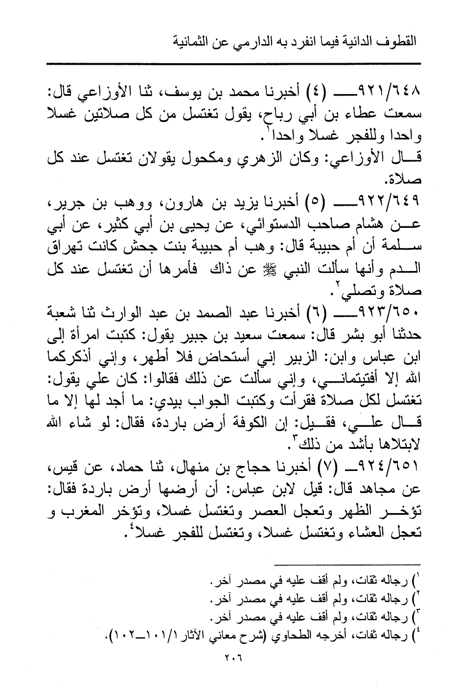 648/ 921 - (4) أخبرنا محمد بن يوسف، ثنا الأوزاعي قال: سمعت عطاء بن أبي رباح، يقول تغتسل من كل صلاتين غسلا واحدا وللفجر غسلا واحدا (¬1).