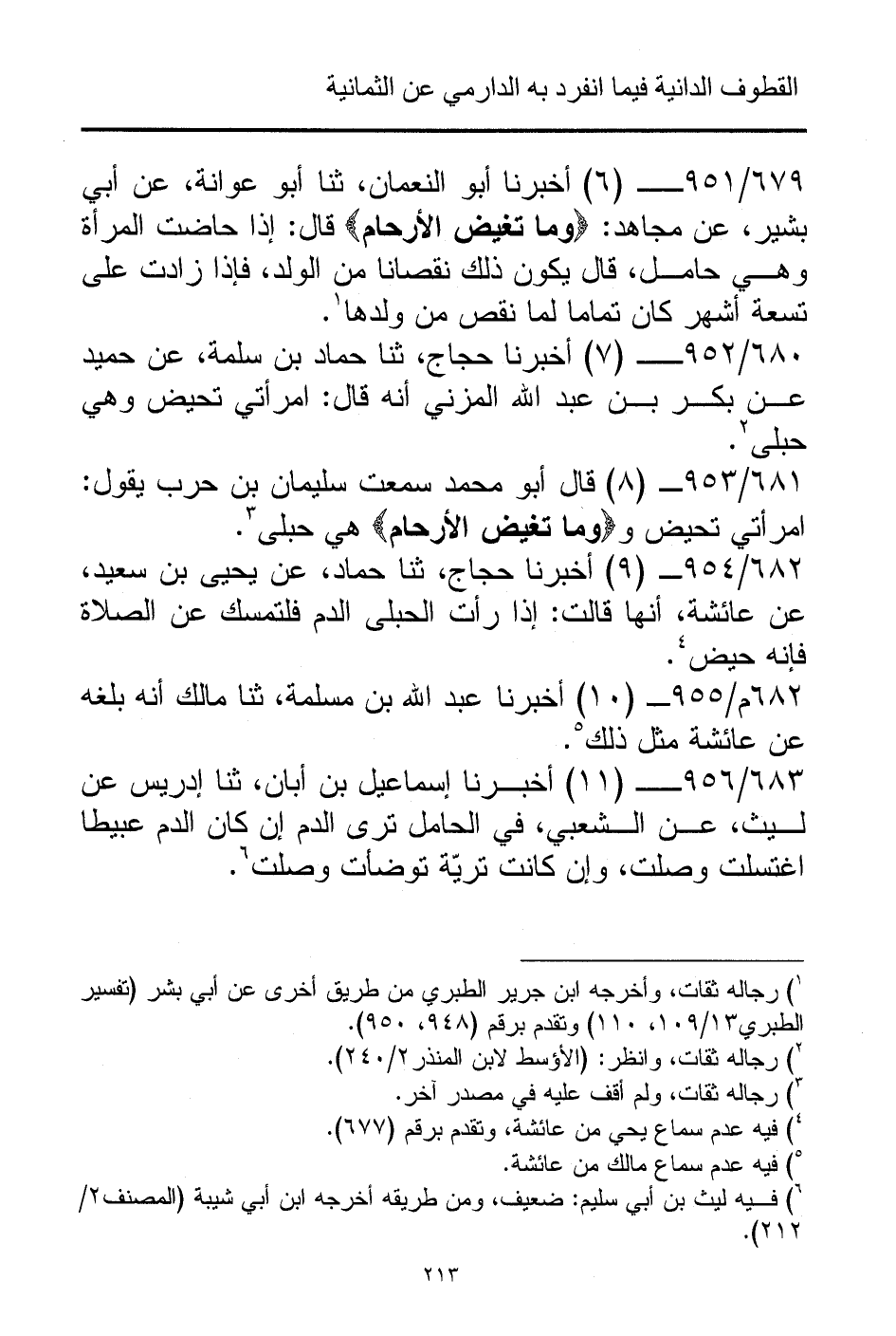 681/ 953 - (8) قال أبو محمد سمعت سليمان بن حرب يقول: امرأتي تحيض و {وَمَا تَغِيضُ الْأَرْحَامُ} هي حبلى (¬3).