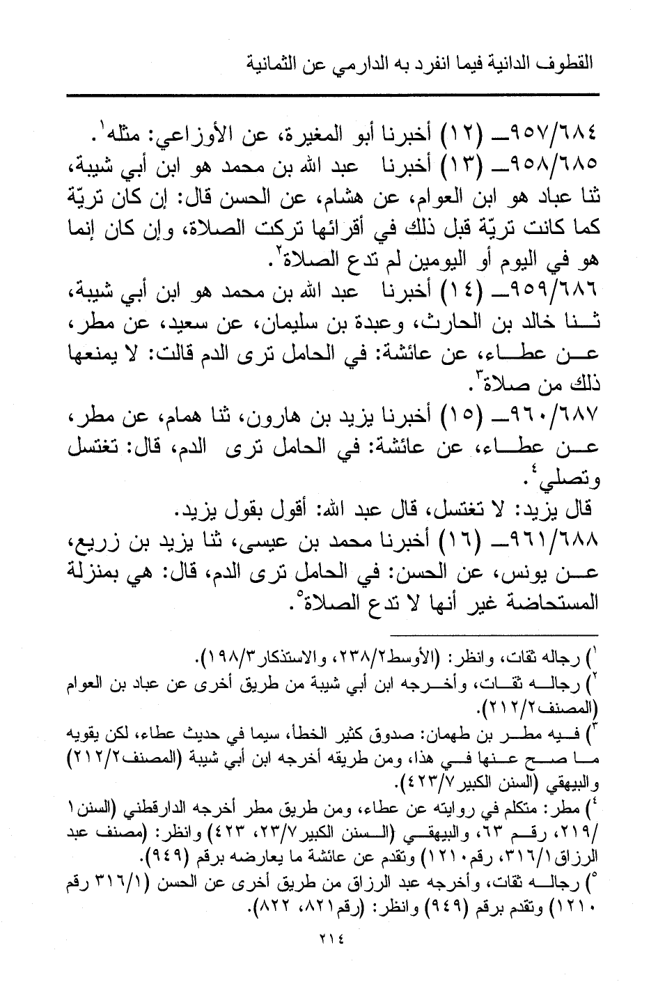 686/ 959 - (14) أخبرنا عبد الله بن محمد هو ابن أبي شيبة، ثنا خالد بن الحارث، وعبدة بن سليمان، عن سعيد، عن مطر، عن عطاء، عن عائشة: في الحامل ترى الدم قالت: لا يمنعها ذلك من صلاة (¬3).
