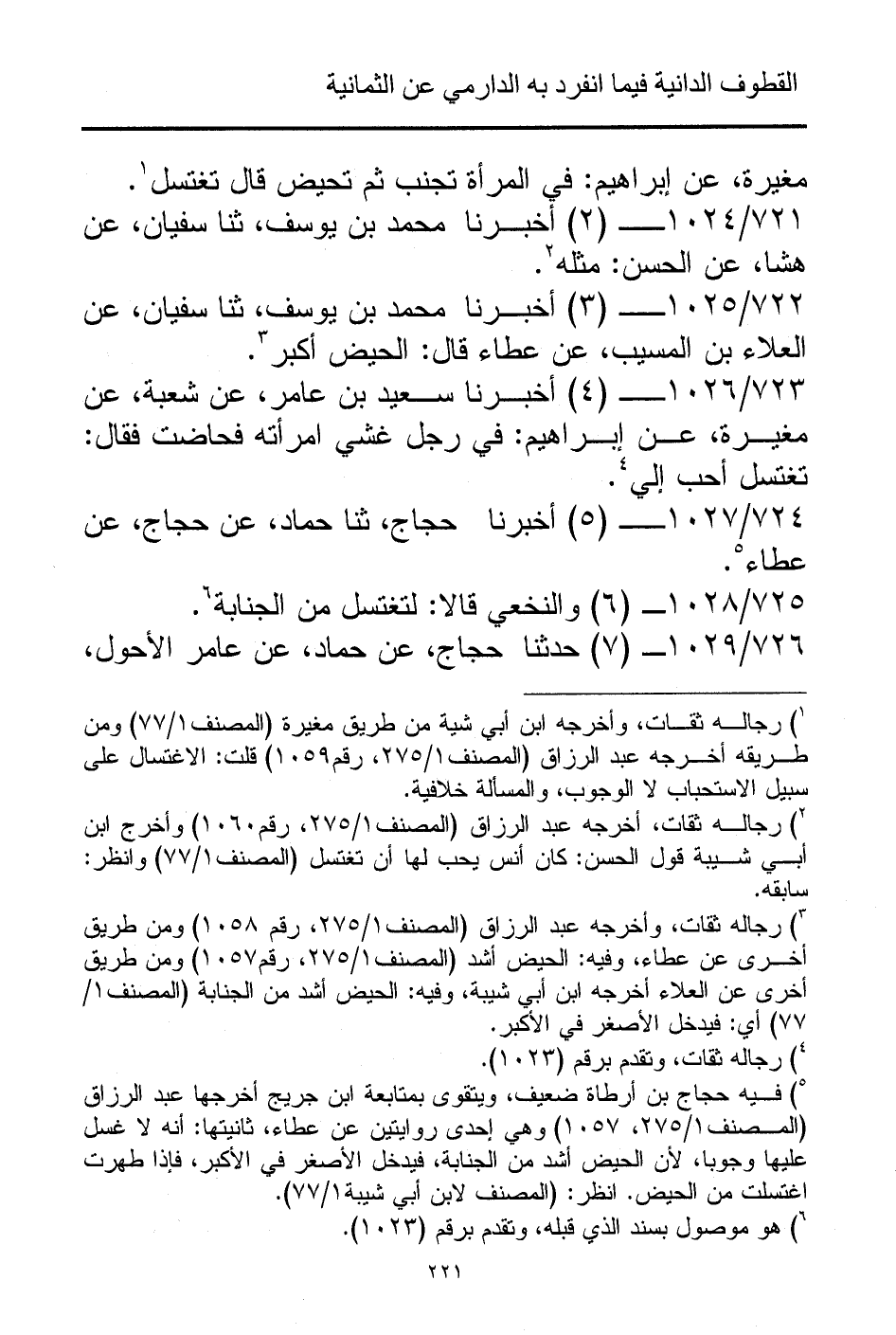 (¬5) فيه حجاج بن أرطاة ضعيف، ويتقوى بمتابعة ابن جريج أخرجها عبد الرزاق (المصنف 1/ 275، 1057) وهي إحدى روايتين عن عطاء، ثانيتها: أنه لا غسل عليها وجوبا، لأن الحيض أشد من الجنابة، فيدخل الأصغر في الأكبر، فإذا طهرت اغتسلت من الحيض. انظر: (المصنف لابن أبي شيبة 1/ 77).