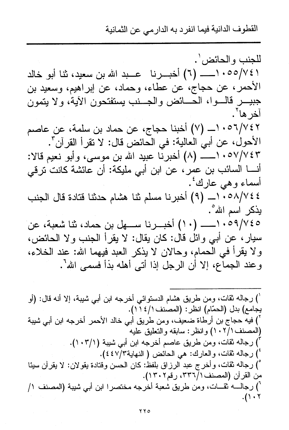742/ 1056 - (7) أخبنا حجاج، عن حماد بن سلمة، عن عاصم الأحول، عن أبي العالية: في الحائض قال: لا تقرأ القرآن (¬3).