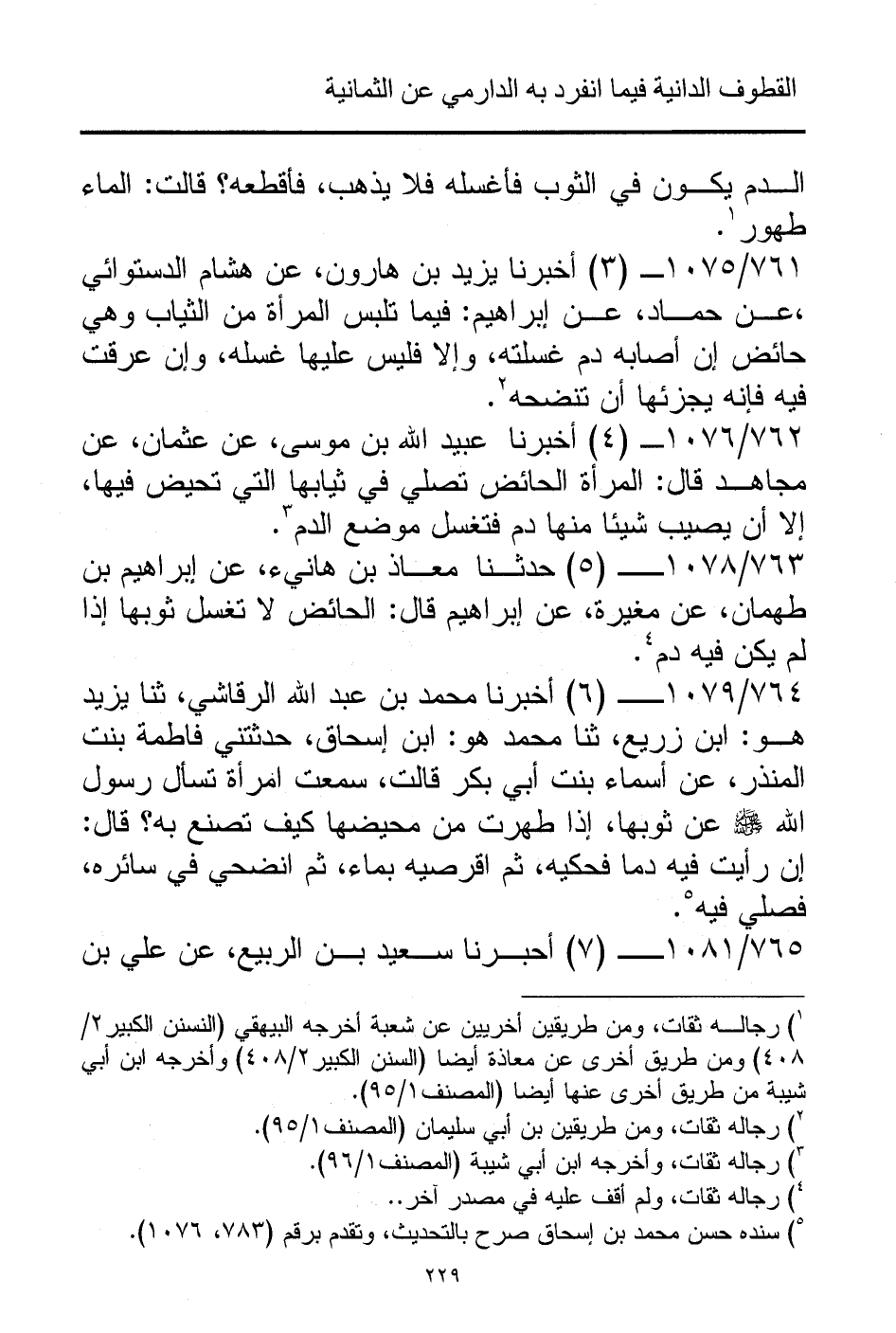 764/ 1079 - (6) أخبرنا محمد بن عبد الله الرقاشي، ثنا يزيد هو: ابن زريع، ثنا محمد هو: ابن إسحاق، حدثتني فاطمة بنت المنذر، عن أسماء بنت أبي بكر قالت، سمعت امرأة تسأل رسول الله - صلى الله عليه وسلم - عن ثوبها، إذا طهرت من محيضها كيف تصنع به؟ قال: إن رأيت فيه دما فحكيه، ثم اقرصيه بماء، ثم انضحي في سائره، فصلي فيه (¬5).