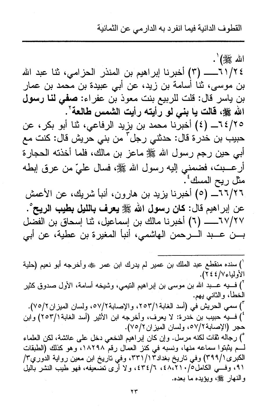 24/ 61 - (3) أخبرنا إبراهيم بن المنذر الحزامي، ثنا عبد الله بن موسى، ثنا أسامة بن زيد، عن أبي عبيدة بن محمد بن عمار بن ياسر قال: قلت للربيع بنت معوذ بن عفراء: صفي لنا رسول الله - صلى الله عليه وسلم -، قالت يا بني لو رأيته رأيت الشمس طالعة (¬2).