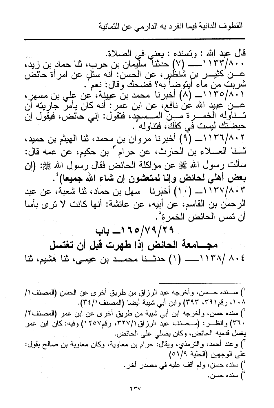 802/ 1136 - (9) أخبرنا مروان بن محمد، ثنا الهيثم بن حميد، ثنا العلاء بن الحارث، عن حرام (¬3) بن حكيم، عن عمه قال: سألت رسول الله - صلى الله عليه وسلم - عن مؤاكلة الحائض فقال رسول الله - صلى الله عليه وسلم -: (إن بعض أهلي لحائض وإنا لمتعشون إن شاء الله جميعا) (¬4).