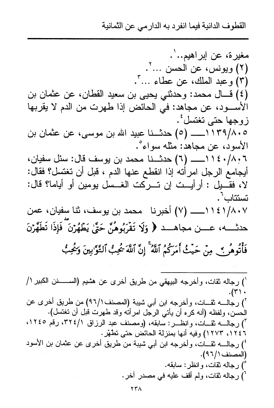 806/ 1140 - (6) حدثنا محمد بن يوسف قال: سئل سفيان، أيجامع الرجل امرأته إذا انقطع عنها الدم، قبل أن تغتسل؟ فقال: لا، فقيل: أرأيت إن تركت الغسل يومين أو أياما؟ قال: تستتاب (¬6).