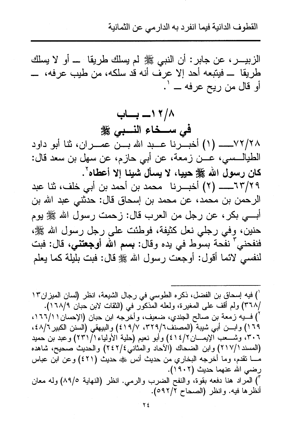 28/ 72 - (1) أخبرنا عبد الله بن عمران، ثنا أبو داود الطيالسي، عن زمعة، عن أبي حازم، عن سهل بن سعد قال: كان رسول الله - صلى الله عليه وسلم - حييا، لا يسأل شيئا إلا أعطاه (¬2).
