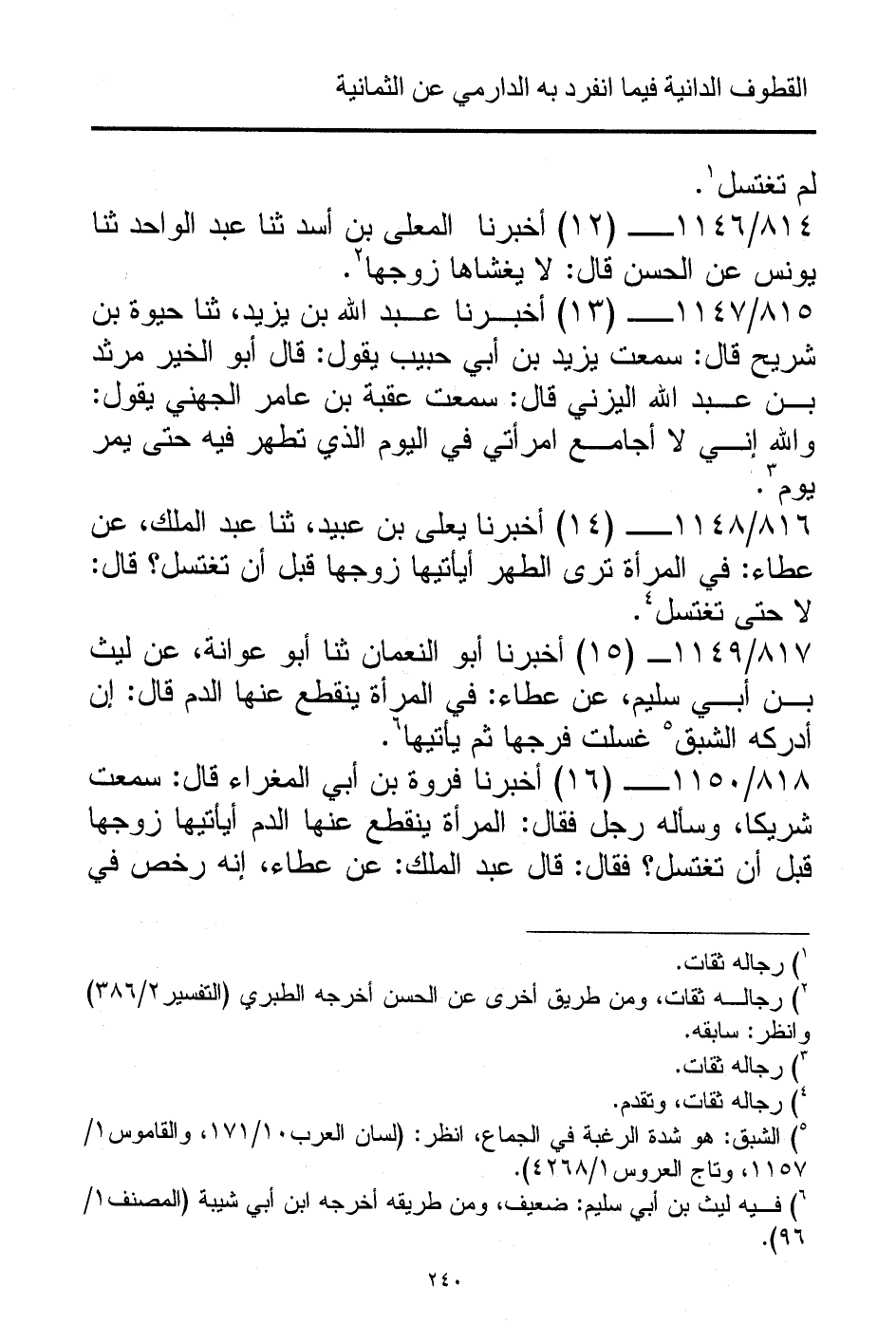 815/ 1147 - (13) أخبرنا عبد الله بن يزيد، ثنا حيوة بن شريح قال: سمعت يزيد بن أبي حبيب يقول: قال أبو الخير مرثد بن عبد الله اليزني قال: سمعت عقبة بن عامر الجهني يقول: والله إني لا أجامع امرأتي في اليوم الذي تطهر فيه حتى يمر يوم (¬3).