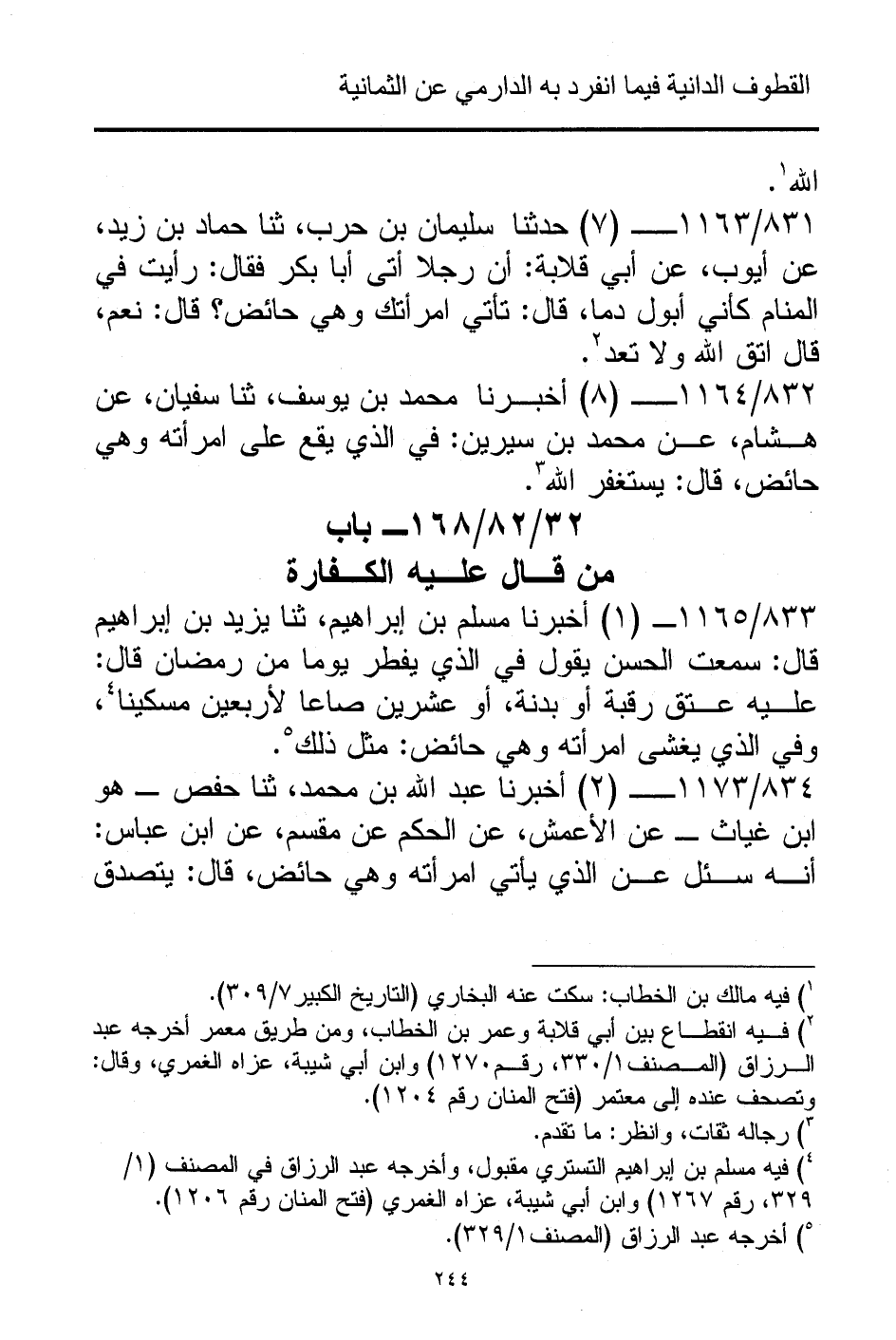833/ 1165 - (1) أخبرنا مسلم بن إبراهيم، ثنا يزيد بن إبراهيم قال: سمعت الحسن يقول في الذي يفطر يوما من رمضان قال: عليه عتق رقبة أو بدنة، أو عشرين صاعا لأربعين مسكينا (¬4)، وفي الذي يغشى امرأته وهي حائض: مثل ذلك (¬5).