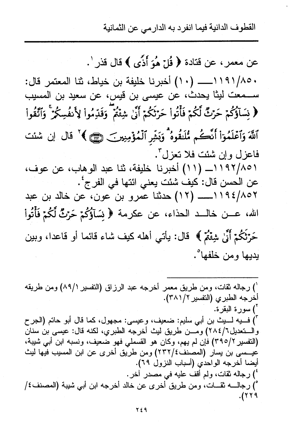 852/ 1194 - (12) حدثنا عمرو بن عون، عن خالد بن عبد الله، عن خالد الحذاء، عن عكرمة {{نِسَاؤُكُمْ حَرْثٌ لَكُمْ فَأْتُوا حَرْثَكُمْ أَنَّى شِئْتُمْ} قال: يأتي أهله كيف شاء قائما أو قاعدا، وبين يديها ومن خلفها (¬5).