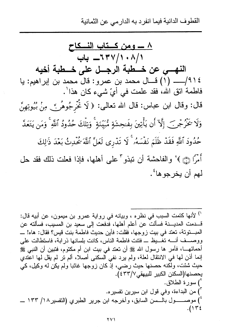 (¬1) لأنها كتمت السبب في نظره، وبيانه في رواية عمرو بن ميمون، عن أبيه قال: قدمت المدينة فسألت عن أعلم أهلها، فدفعت إلى سعيد بن المسيب، فسألته عن المبتوتة، تعتد في بيت زوجها، فقلت: فأين حديث فاطمة بنت قيس؟ فقال: هاه! - ووصف أنه تغيظ - فتنت فاطمة الناس، كانت بلسانها ذرابة، فاستطالت على أحمائها، فأمر ها رسول الله - صلى الله عليه وسلم - أن تعتد في بيت ابن أم مكتوم، فتبين أن النبي - صلى الله عليه وسلم - إنما أذن لها في الانتقال لعلة، ولم يرد نفي السكنى أصلا، ألم تر لم يقل لها اعتدي حيث شئت، ولكنه حصنها حيث رضي، إذ كان زوجها غائبا ولم يكن له وكيل، كي يحصنها (السكنن الكبير للبيهقي 7/ 433).