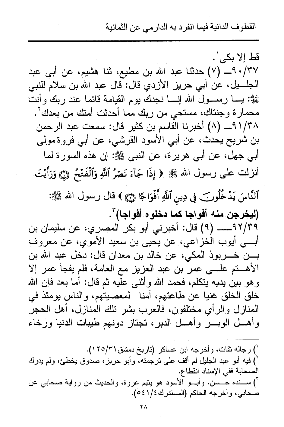 38/ 91 - (8) أخبرنا القاسم بن كثير قال: سمعت عبد الرحمن بن شريح يحدث، عن أبي الأسود القرشي، عن أبي فروة مولى أبي جهل، عن أبي هريرة، عن النبي - صلى الله عليه وسلم -: إن هذه السورة لما أنزلت على رسول الله - صلى الله عليه وسلم - ... {وَرَأَيْتَ النَّاسَ يَدْخُلُونَ فِي دِينِ اللَّهِ أَفْوَاجًا} (¬3) قال رسول الله - صلى الله عليه وسلم -: (ليخرجن منه أفواجا كما دخلوه أفواجا) (¬4).