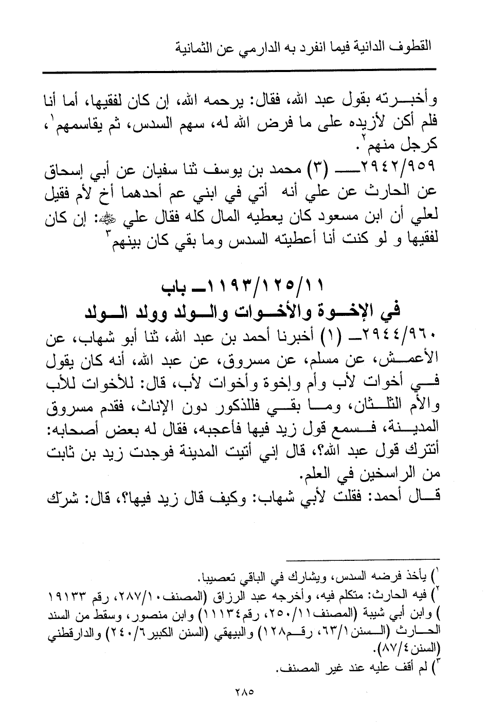(¬2) فيه الحارث: متكلم فيه، وأخرجه عبد الرزاق (المصنف 10/ 287، رقم 19133) وابن أبي شيبة (المصنف 11/ 250، رقم 11134) وابن منصور، وسقط من السند الحارث (السنن 1/ 63، رقم 128) والبيهقي (السنن الكبير 6/ 240) والدارقطني (السنن 4/ 87).