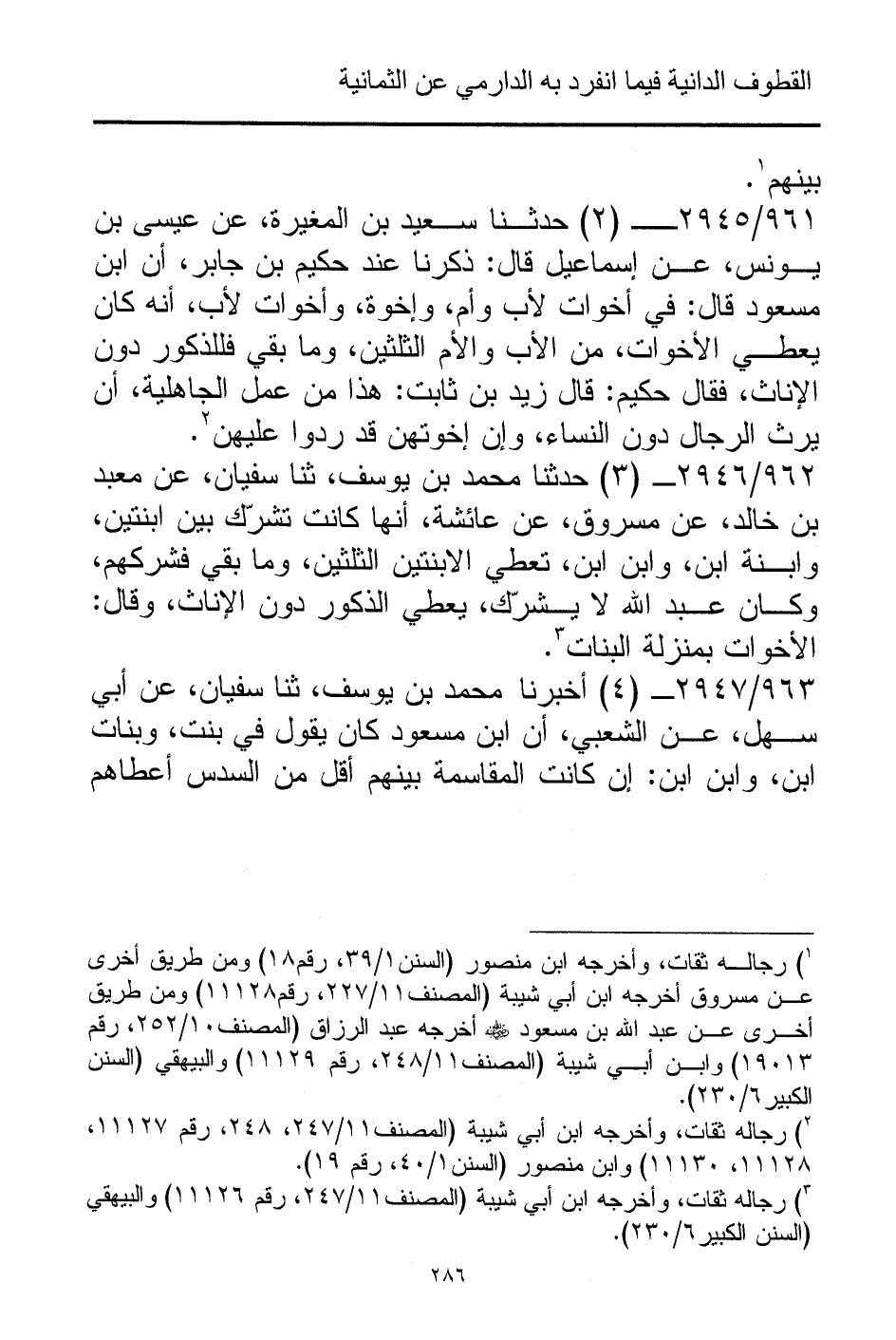 (¬1) رجاله ثقات، وأخرجه ابن منصور (السنن 1/ 39، رقم 18) ومن طريق أخرى عن مسروق أخرجه ابن أبي شيبة (المصنف 11/ 227، رقم 11128) ومن طريق أخرى عن عبد الله بن مسعود - رضي الله عنه - أخرجه عبد الرزاق (المصنف 10/ 252، رقم 19013) وابن أبي شيبة (المصنف 11/ 248، رقم 11129) والبيهقي (السنن الكبير 6/ 230).