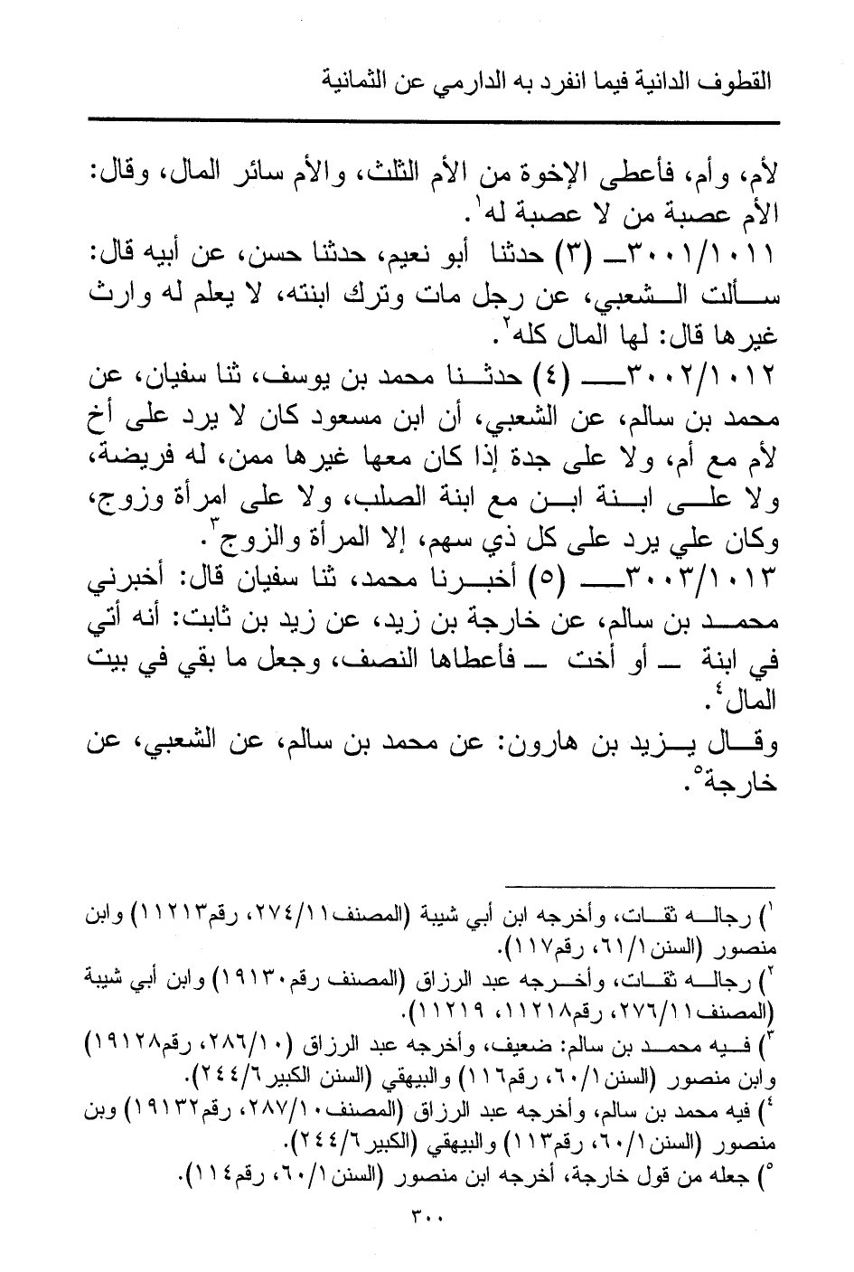 1012/ 3002 - (4) حدثنا محمد بن يوسف، ثنا سفيان، عن محمد بن سالم، عن الشعبي، أن ابن مسعود كان لا يرد على أخ لأم مع أم، ولا على جدة إذا كان معها غيرها ممن، له فريضة، ولا على ابنة ابن مع ابنة الصلب، ولا على امرأة وزوج، وكان علي يرد على كل ذي سهم، إلا المرأة والزوج (¬3).