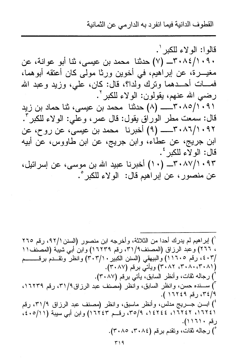 1091/ 3085 - (8) حدثنا محمد بن عيسى، ثنا حماد بن زيد قال: سمعت مطر الوراق يقول: قال عمر، وعلي: الولاء للكبر (¬3).