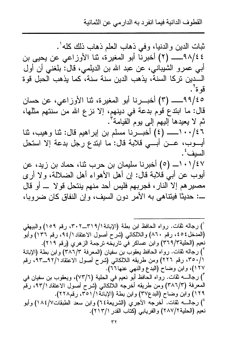 45/ 99 - (3) أخبرنا أبو المغيرة، ثنا الأوزاعي، عن حسان قال: ما ابتدع قوم بدعة في دينهم، إلا نزع الله من سنتهم مثلها، ثم لا يعيدها إليهم إلى يوم القيامة (¬3).